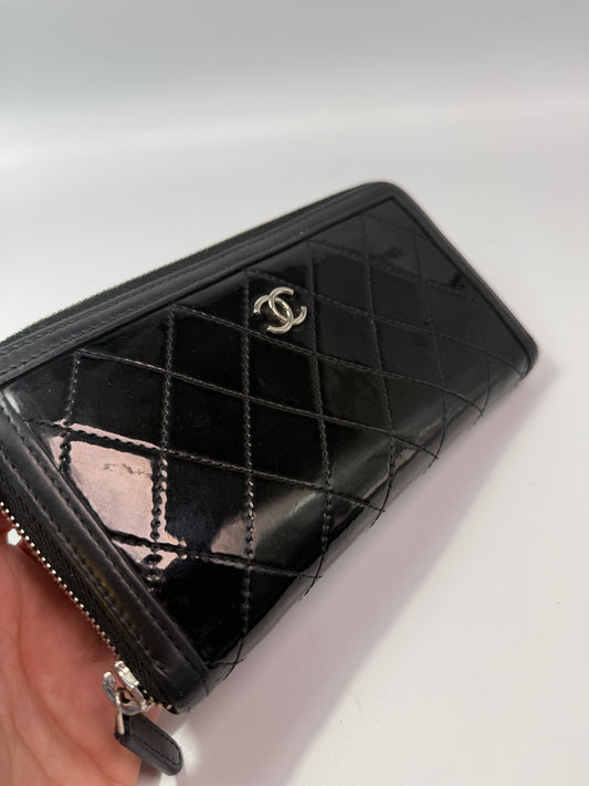 Chanel Black Patent Leather Diamond Stitched Zippy Wallet