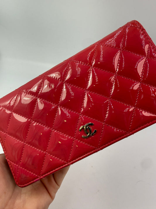 Chanel Fuschia Pink Quilted Patent Leather Long Bifold Wallet with Box