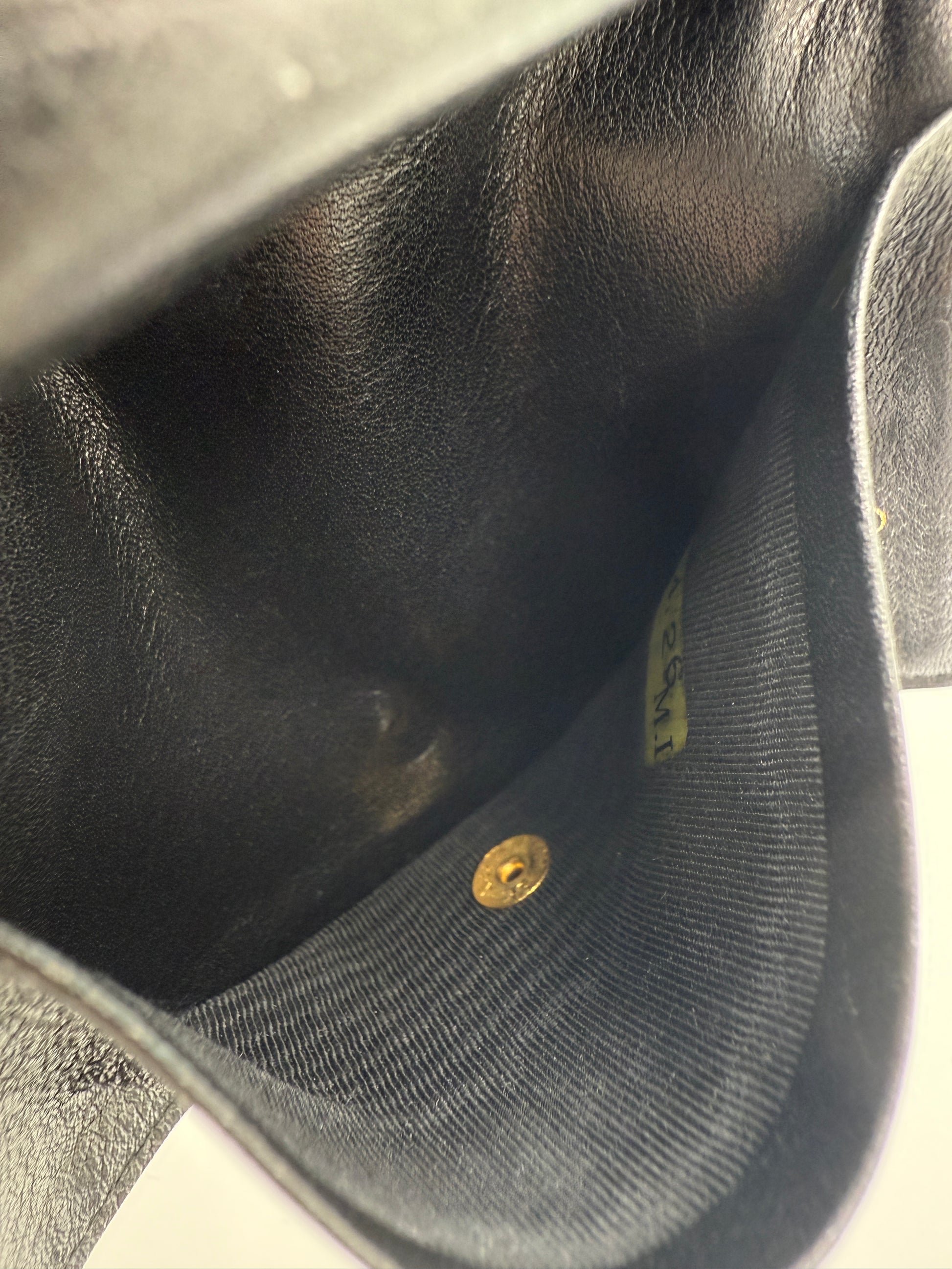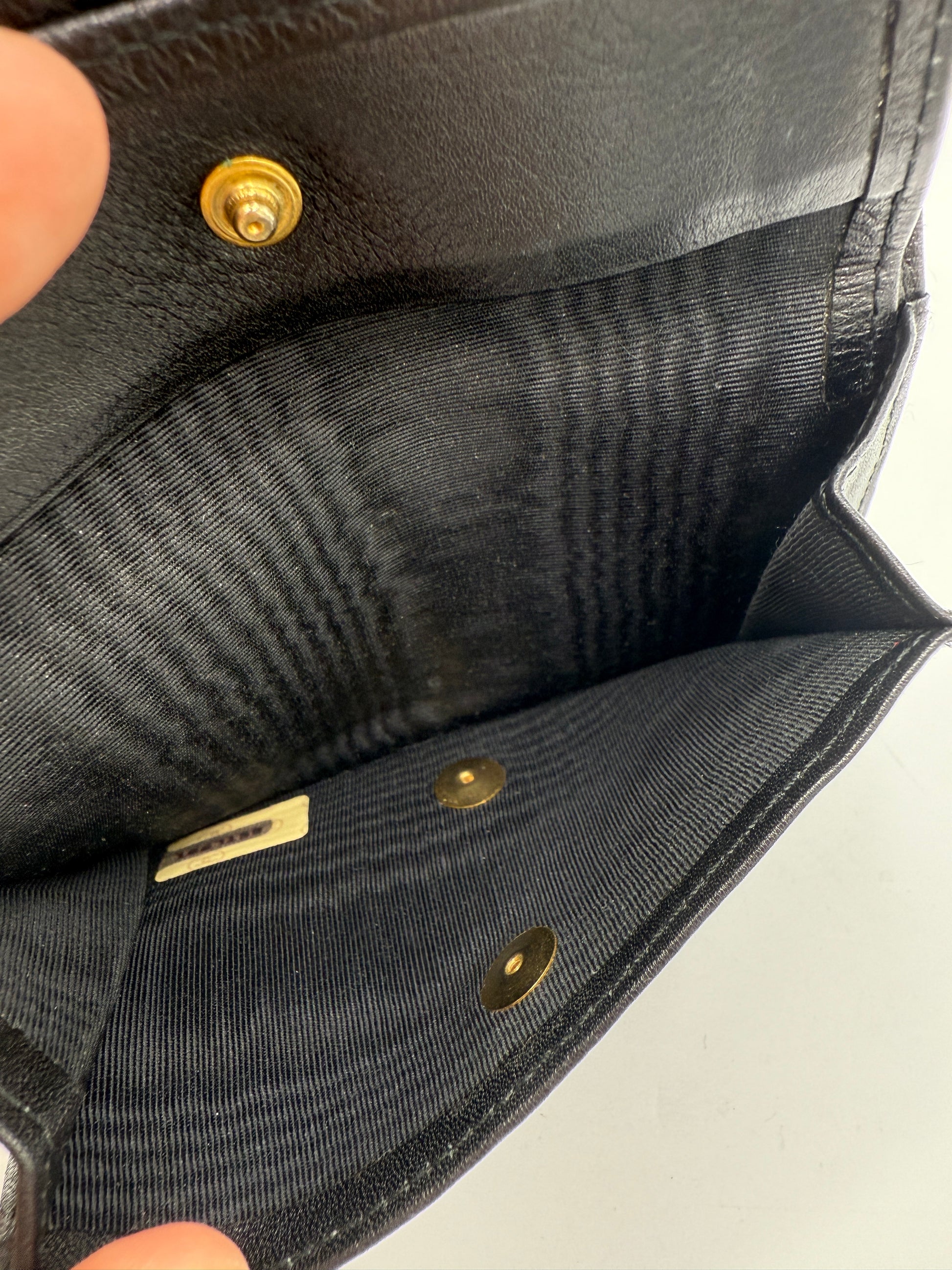 The front features a small gold Chanel CC logo, showcasing light silvering that adds vintage character. A secure bi-fold snap closure opens to reveal multiple card slots, slip pockets, and a dedicated coin compartment with its own snap closure, making it perfect for keeping your essentials organized in style.