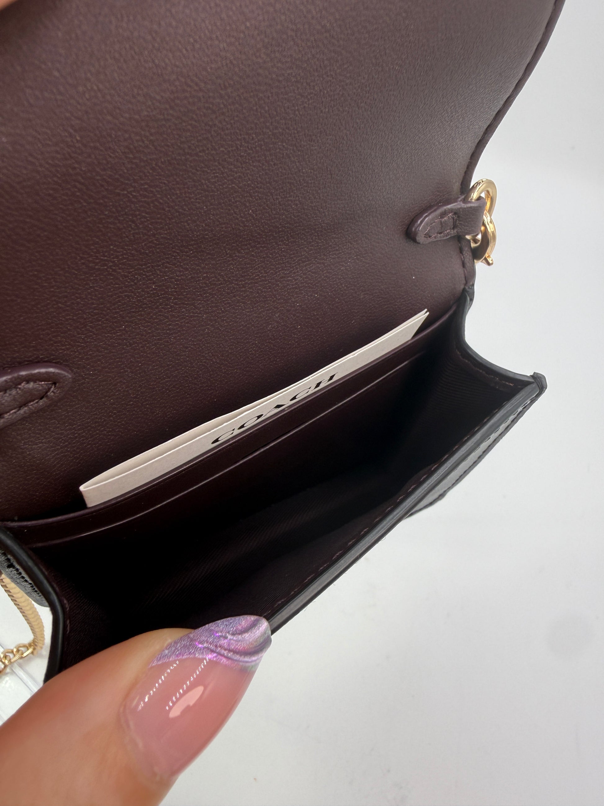 This COACH Signature Chain Wallet is a versatile and stylish small leather good that effortlessly transitions from day to night. Crafted in COACH’s iconic Signature coated canvas with a durable fabric lining, this compact piece reflects the brand’s legacy of combining practicality with modern American luxury. Its structured yet lightweight design makes it an ideal option for carrying just the essentials while maintaining a polished designer look.