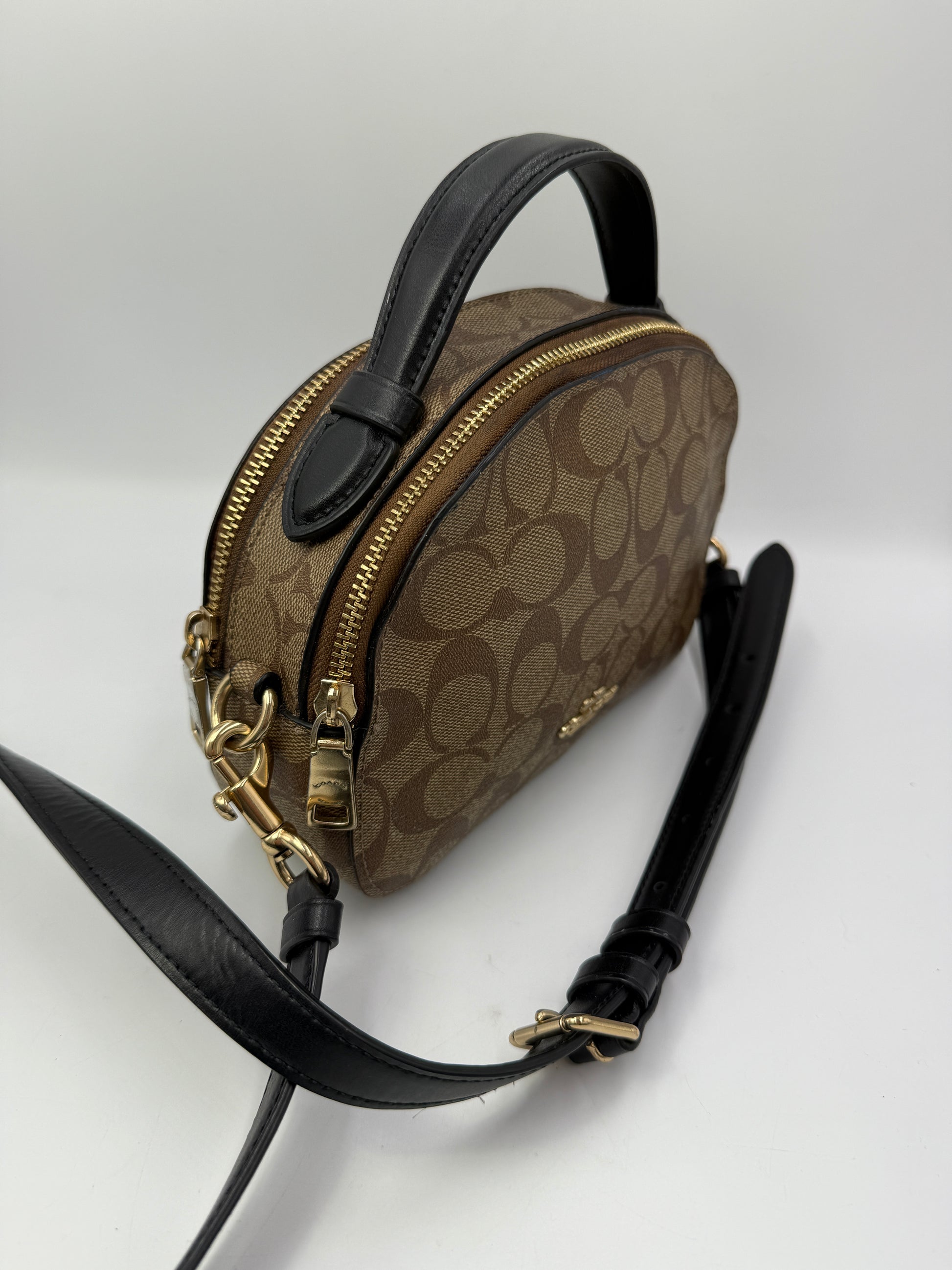 Coach Serena Beige and Brown Crossbody with Matching Wallet Set — the perfect blend of neutral elegance and everyday function. This structured piece features a beige and brown coated canvas exterior with gold tone hardware throughout, giving it that classic, polished Coach look. The crossbody includes a removable and adjustable black strap for comfortable hands-free wear.