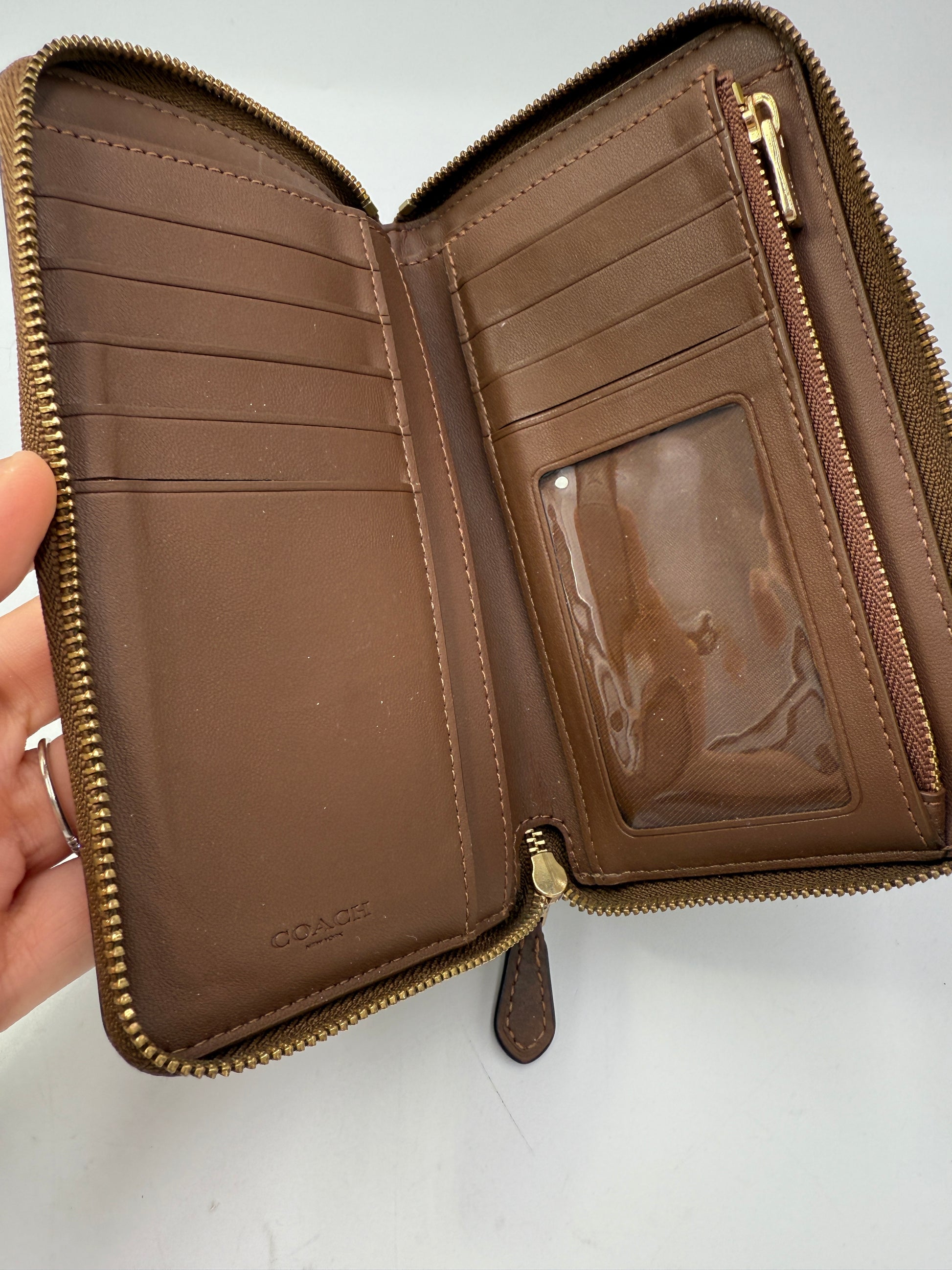 Included in this listing is a matching Coach zippy wallet in the same beige and brown color scheme. The wallet features a full zip-around closure and organized interior compartments for cards, cash, and coins, making it a complete grab-and-go set.