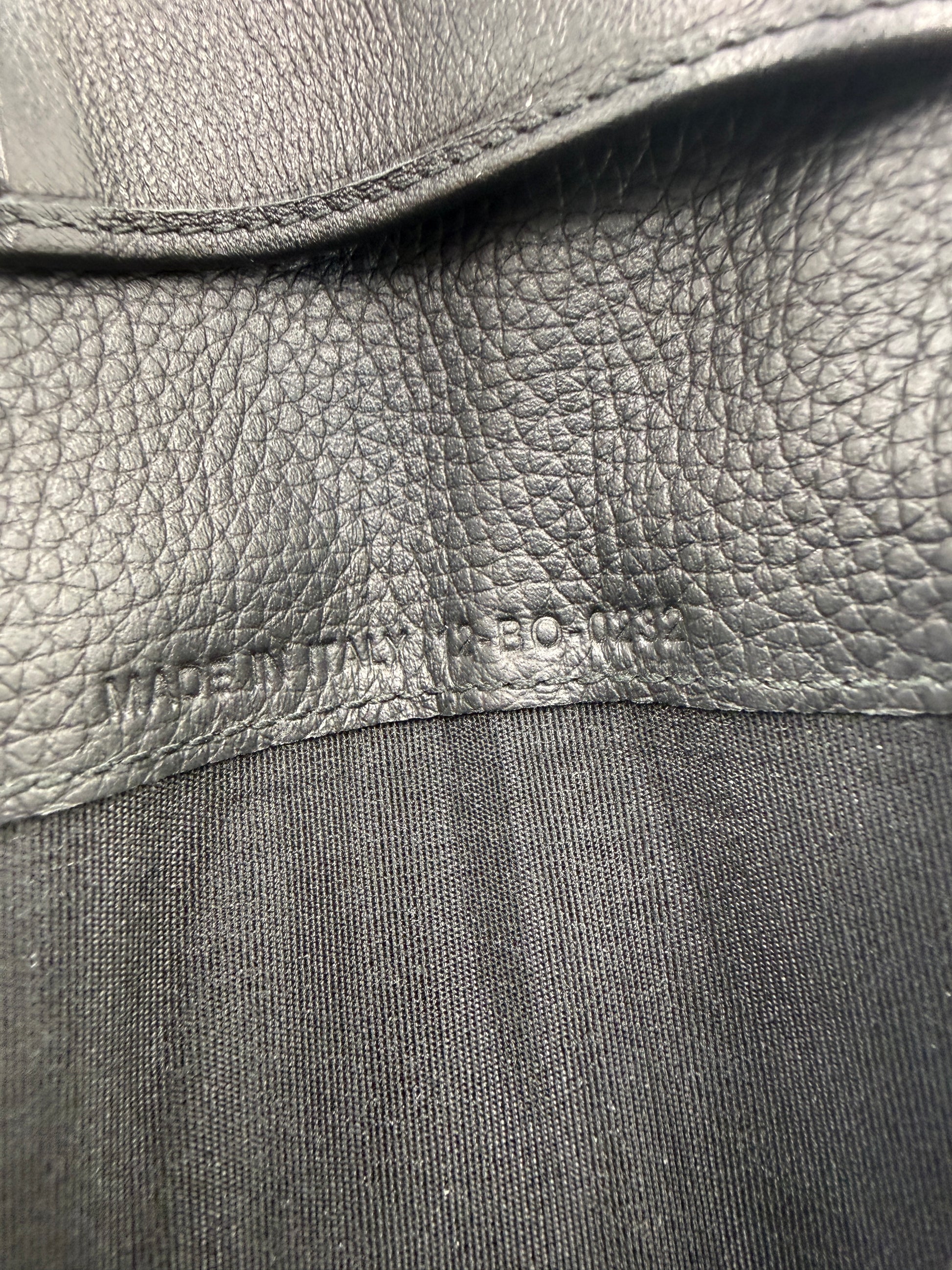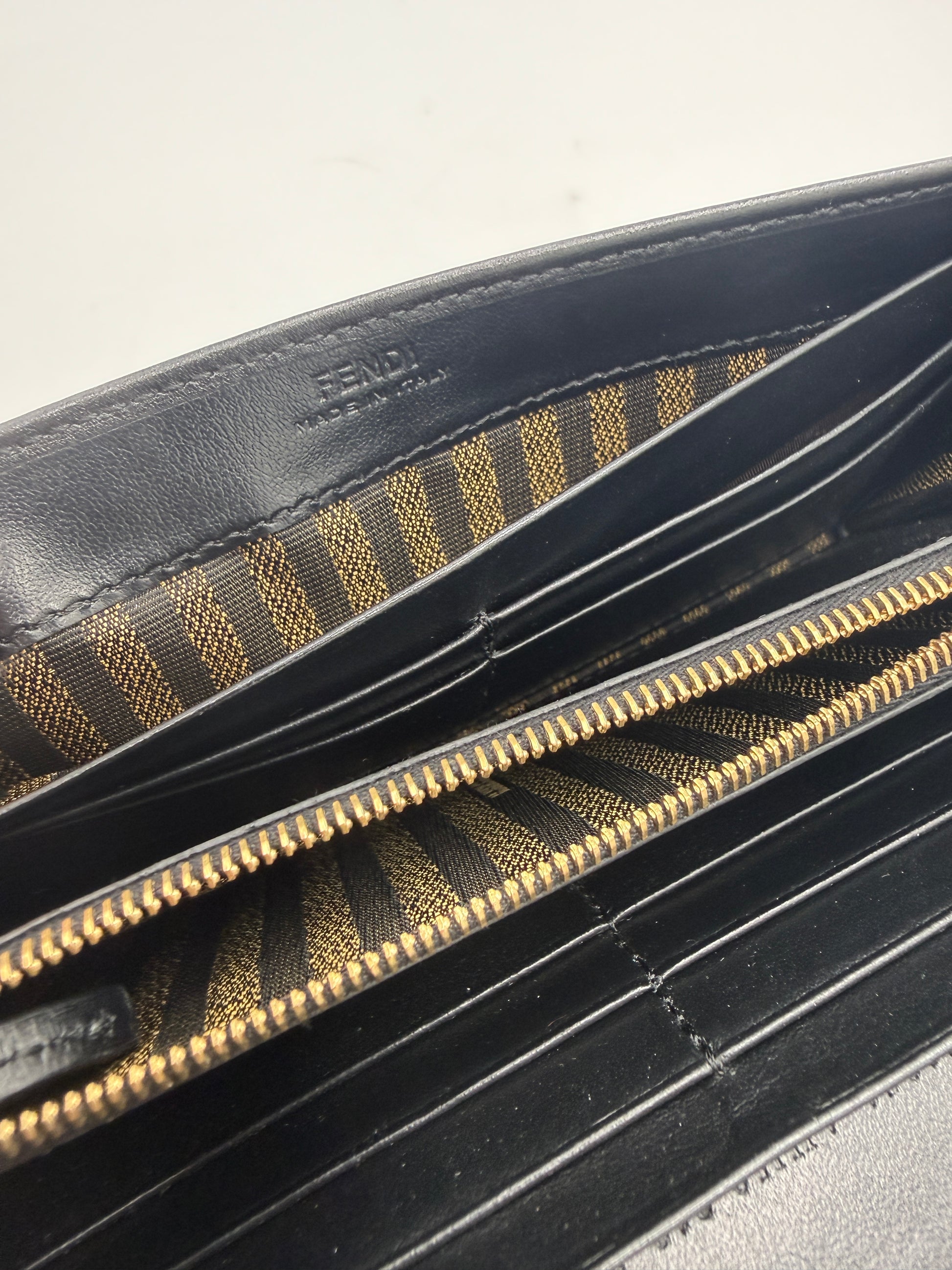 Crafted from smooth black leather, the exterior is adorned with Fendi’s iconic gold-tone FF baguette snap logo, a subtle yet powerful detail that defines luxury. Inside, the wallet opens to reveal a beautifully lined interior featuring the signature Fendi Pequin canvas alongside black leather trim, creating a refined contrast. With 12 card slots, multiple compartments, and a secure zippered coin pocket, it ensures your essentials remain organized and accessible. Both the serial code and hologram are intact, confirming its authenticity and heritage.