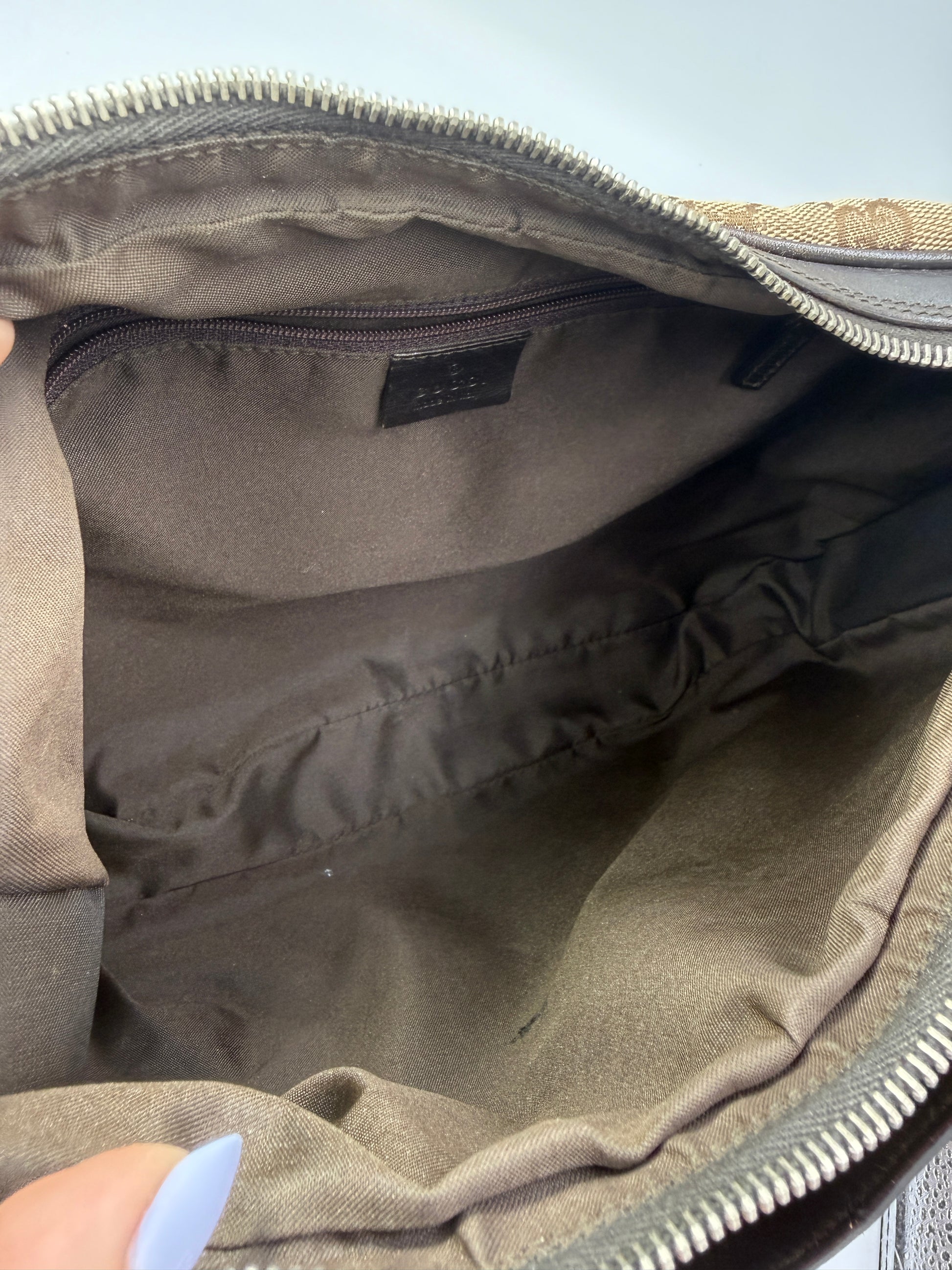 The piping is in excellent condition with no exposure, showing true care and quality, while only slight rubs on the exterior canvas are visible upon close inspection. A unique silver-tone “G” clasp allows you to fold and style the bag into a different shape for versatile wear.