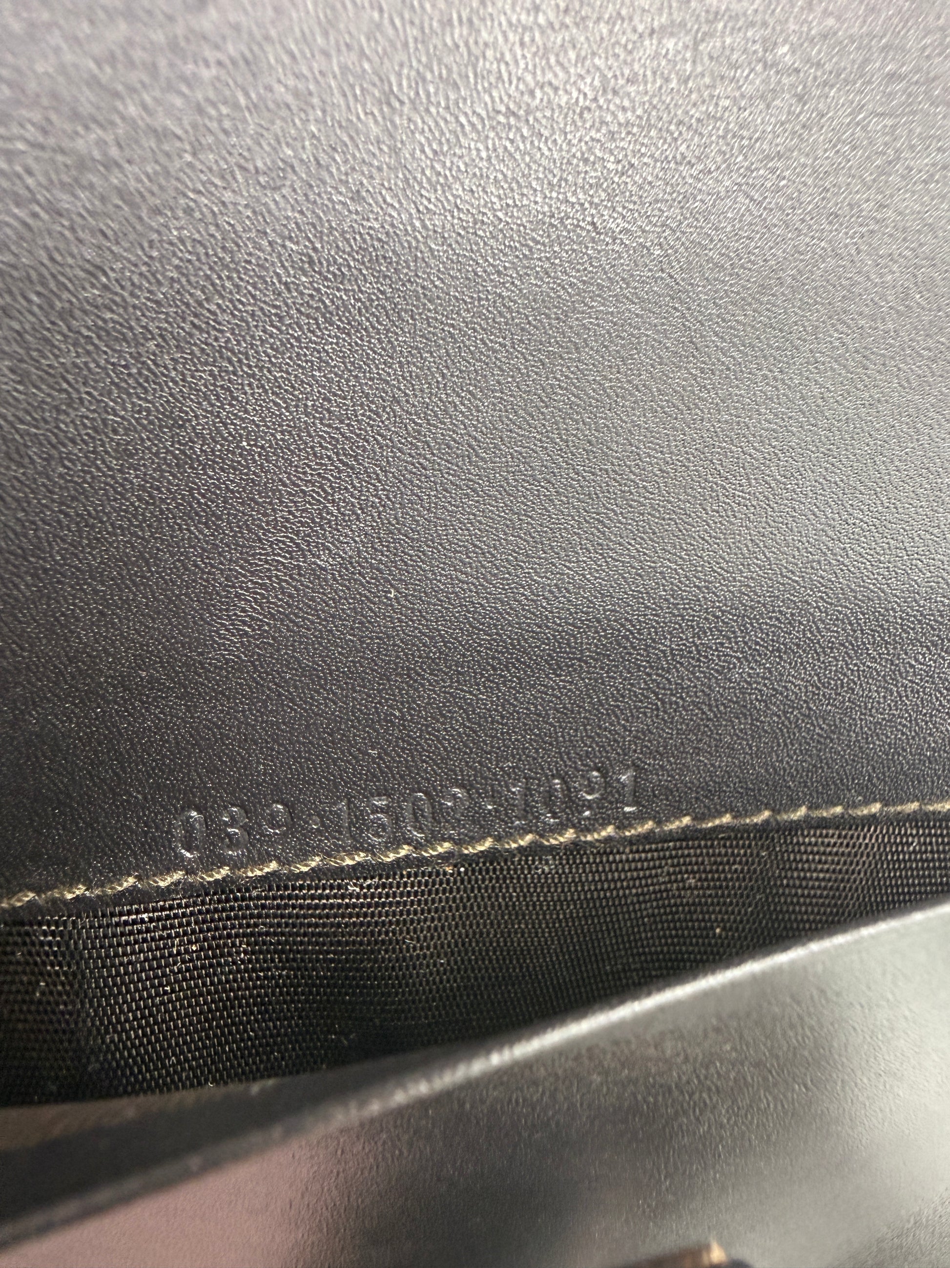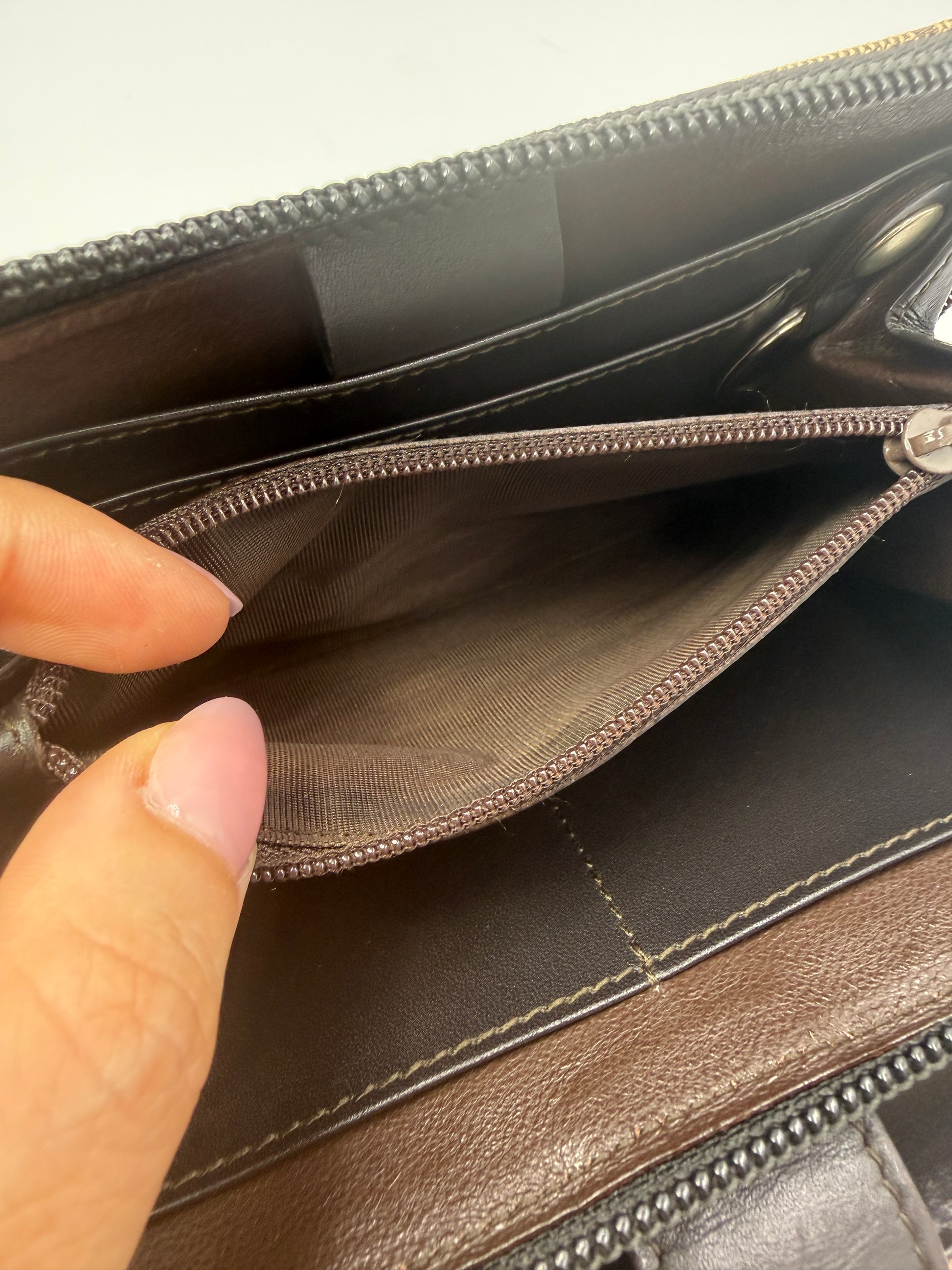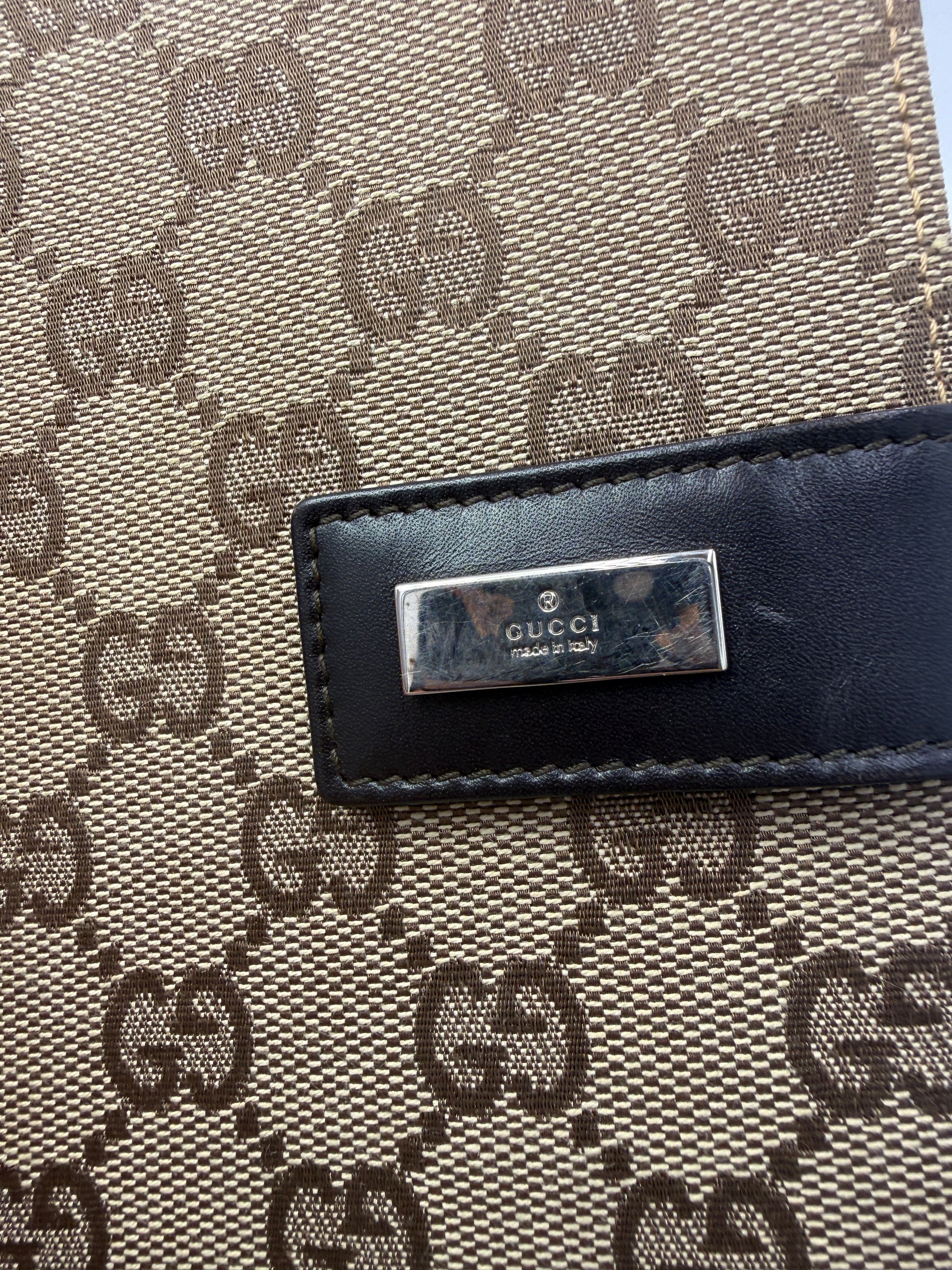 Signature beige and ebony GG Supreme coated canvas exterior with brown leather trim and silver-tone hardware. Features a sleek leather snap closure engraved with the Gucci logo. Interior includes an original Gucci notepad on one side and an organizer wallet compartment on the other, complete with multiple card slots, a zippered pocket, and a removable key loop. Can easily fit a passport, making it perfect for travel or daily organization. Comes with original Gucci box.