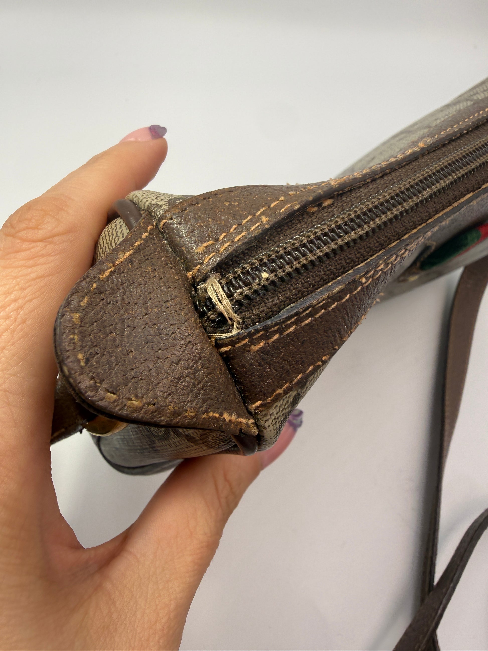 Vintage Gucci GG Supreme Monogram Crossbody Bag crafted in the house’s iconic beige and brown GG Supreme coated canvas, accented with rich brown leather trim throughout. This timeless silhouette features Gucci’s signature green and red Web stripe on the front, a historic design element inspired by the brand’s equestrian roots and introduced during Gucci’s mid-century era. Gold-tone hardware completes the look, including the adjustable leather shoulder strap and classic Gucci zipper pull.