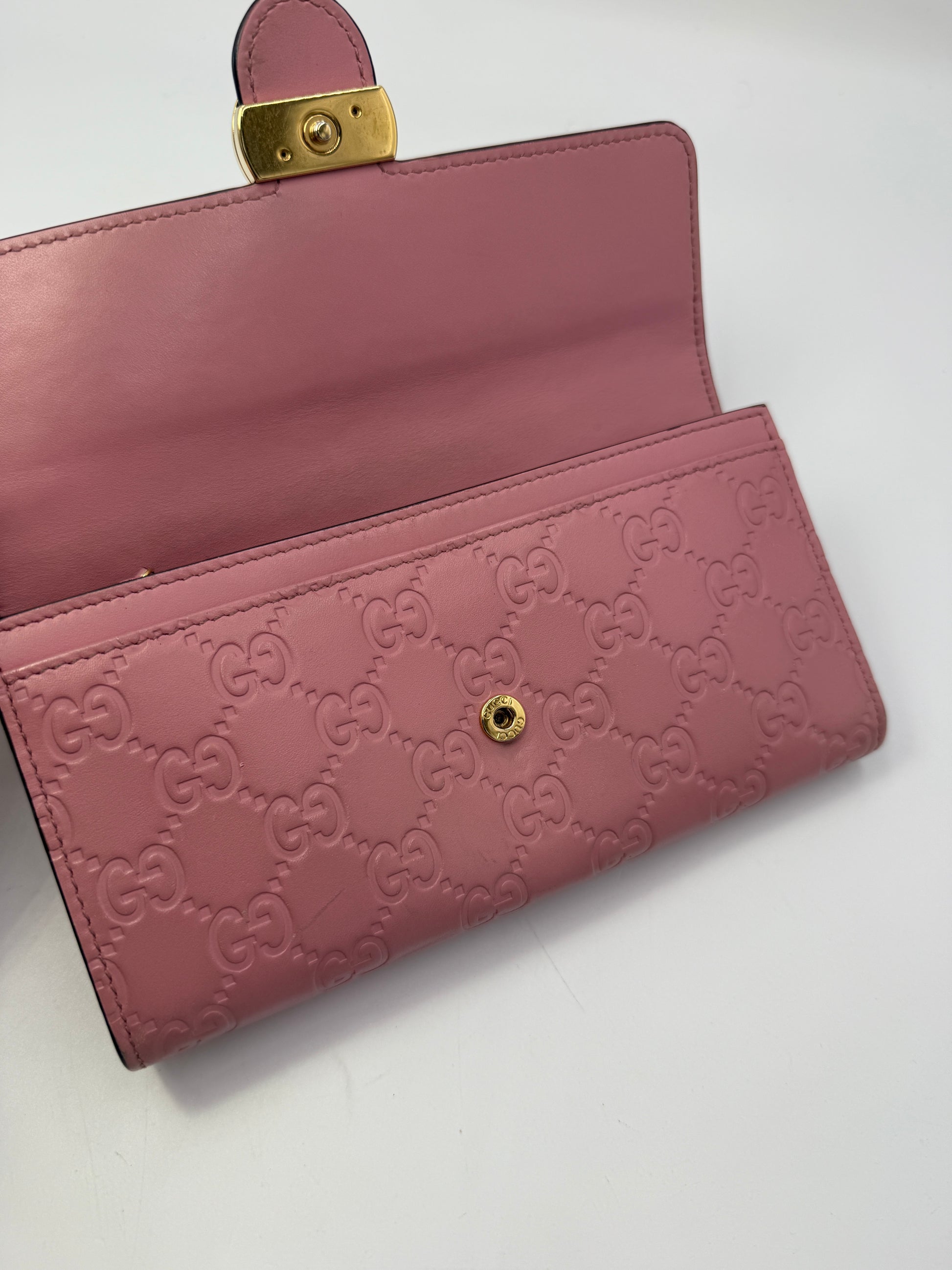 Crafted from premium all-leather in Gucci’s iconic Guccissima monogram embossing, this eye-catching piece features elegant gold-tone interlocking Gs on the exterior, symbolizing timeless sophistication. The soft pink hue adds a feminine touch, making it a standout accessory for any occasion.