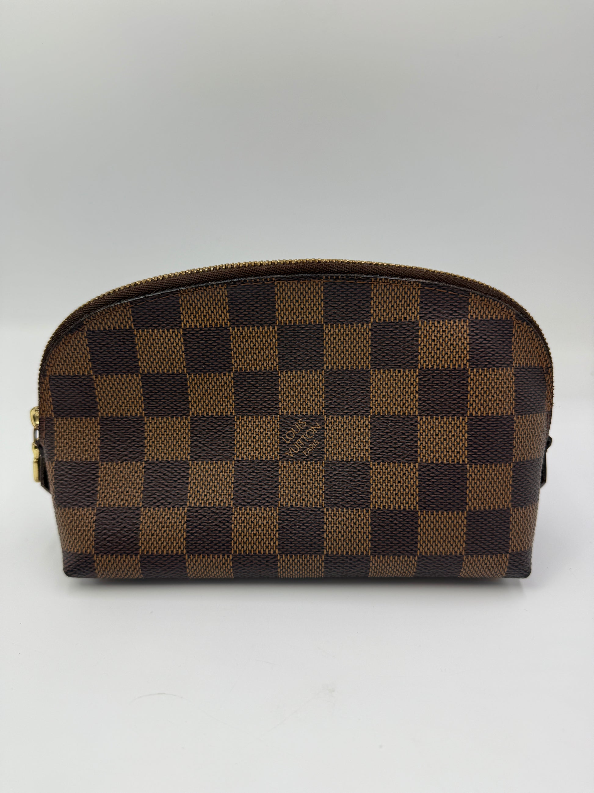 Add a touch of luxury to your everyday routine with this pre-owned Louis Vuitton Damier Ebene Cosmetic Pouch—a chic and functional accessory that’s as stylish as it is practical.