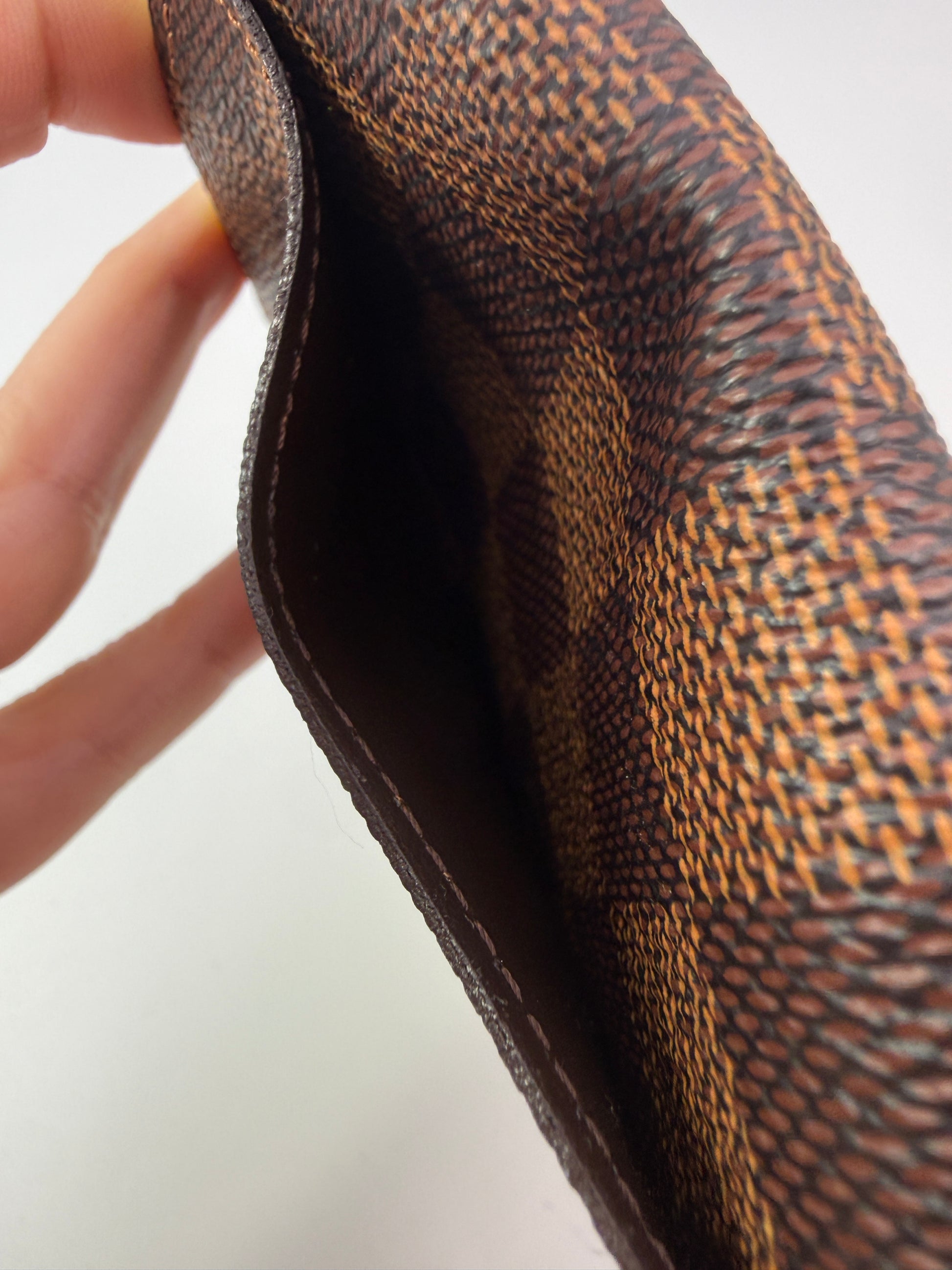 Louis Vuitton Damier Ebene coated canvas bifold card holder featuring a striking neon green cross-grain leather interior. This modern design offers a bold contrast to the classic Damier Ebene exterior, making it both timeless and fashion-forward. Crafted in France, this piece showcases Louis Vuitton’s signature coated canvas known for its durability and resistance to daily wear, paired with a vibrant interior that elevates an everyday essential.