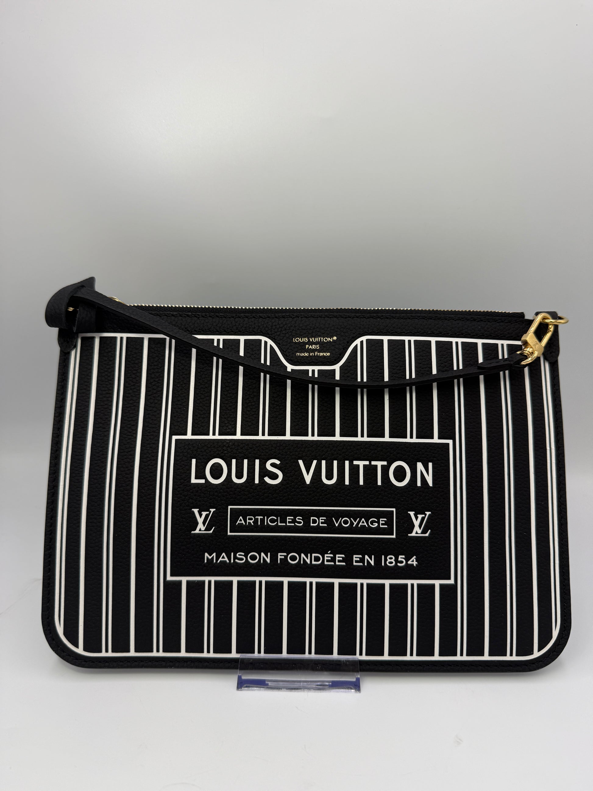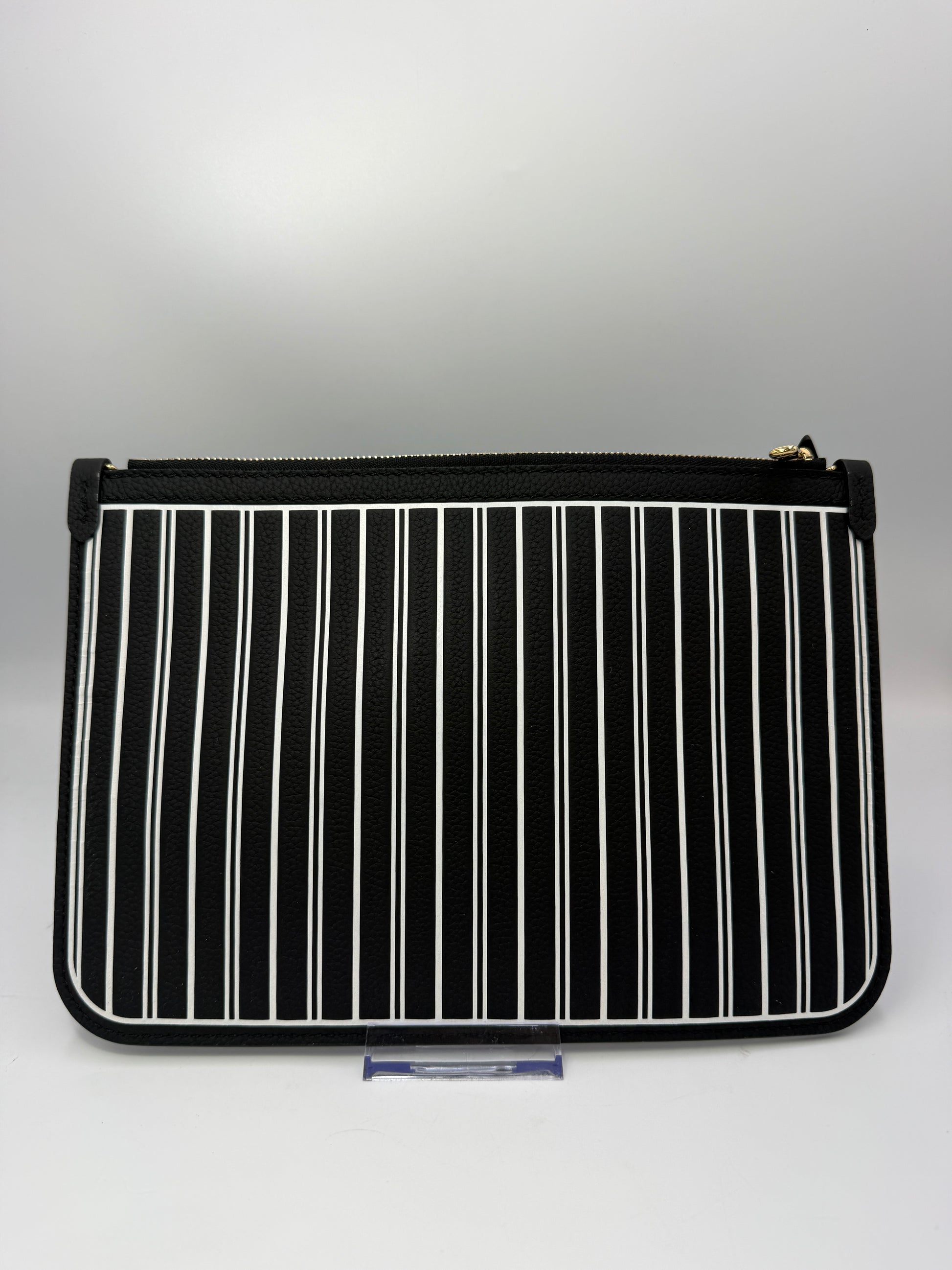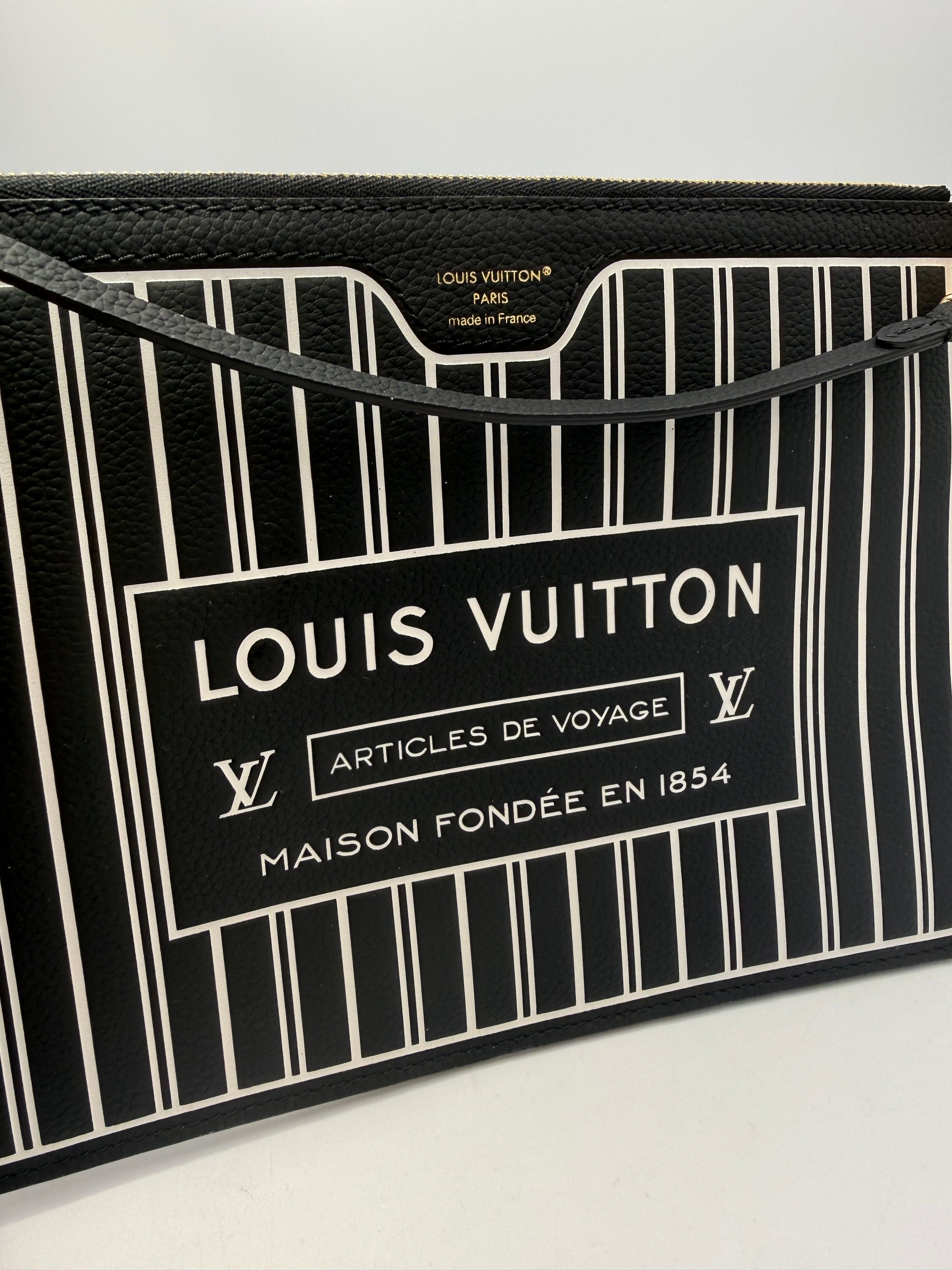 Louis Vuitton Leather Inside Out Neverfull Pouch in the largest size. This sophisticated pouch features an exterior crafted in supple black leather with bold white stripes, paired with gleaming gold tone hardware, all in perfect working condition. The interior is lined with Louis Vuitton’s signature monogram coated canvas for a unique contrast of textures and design.