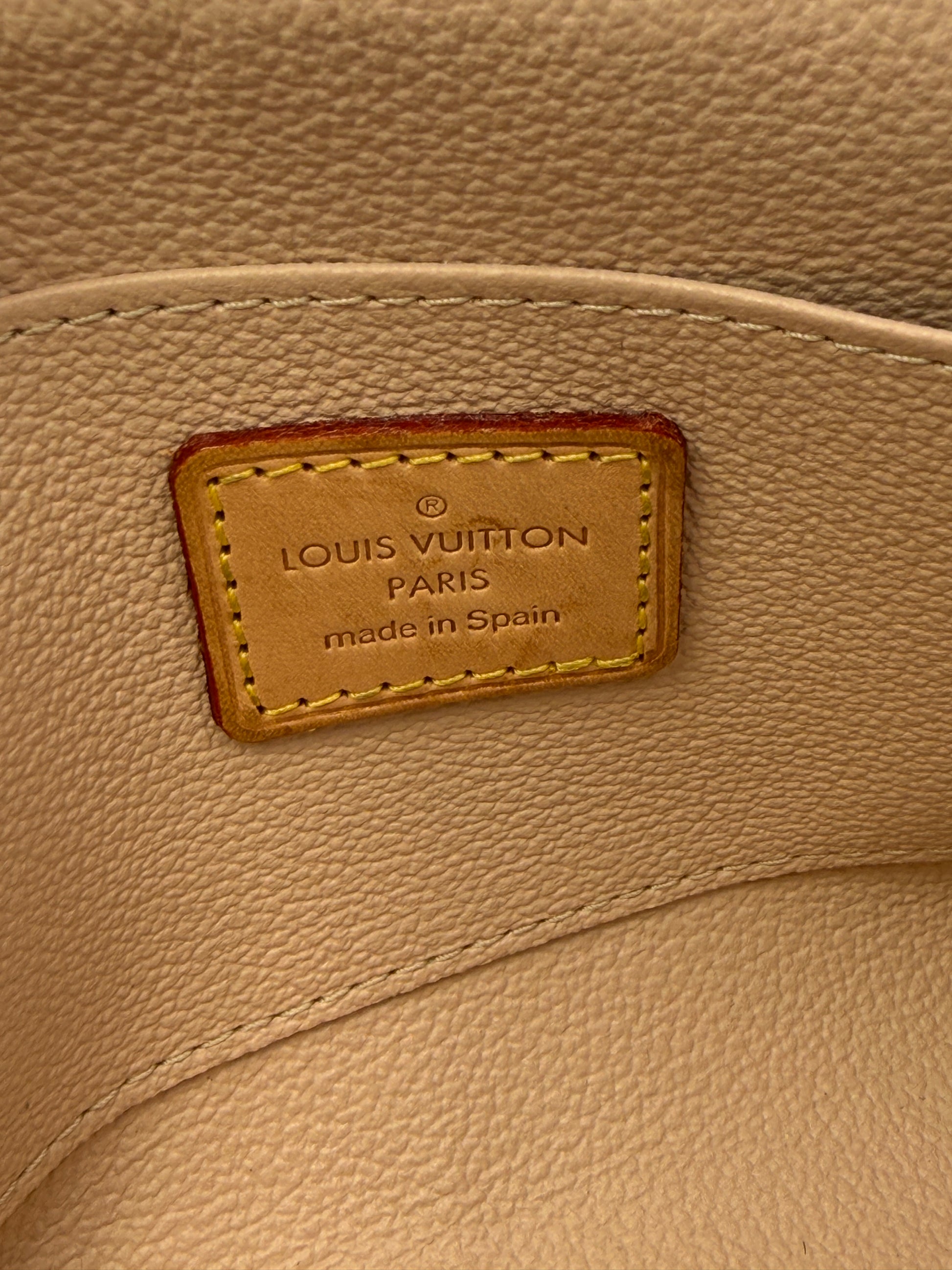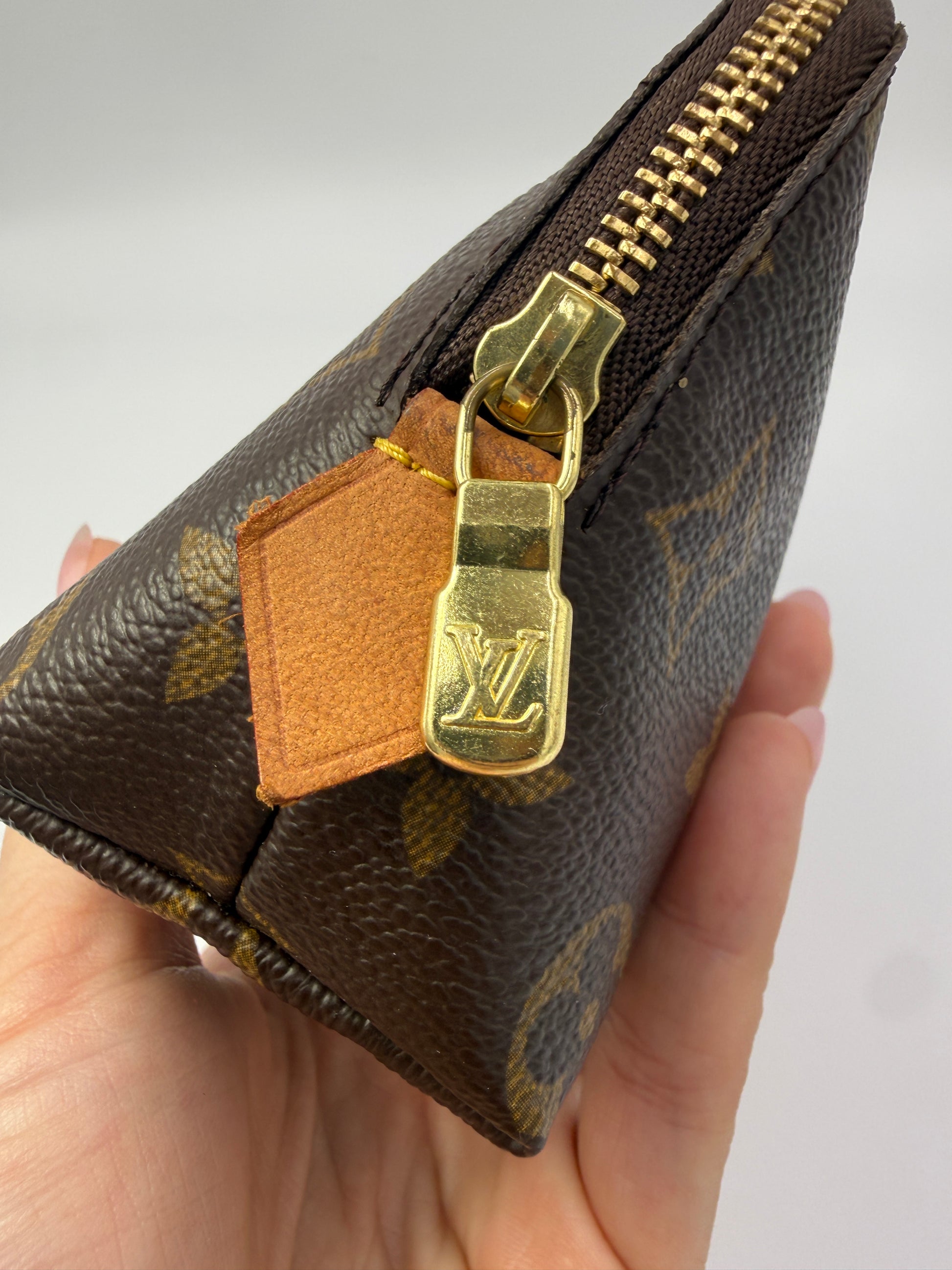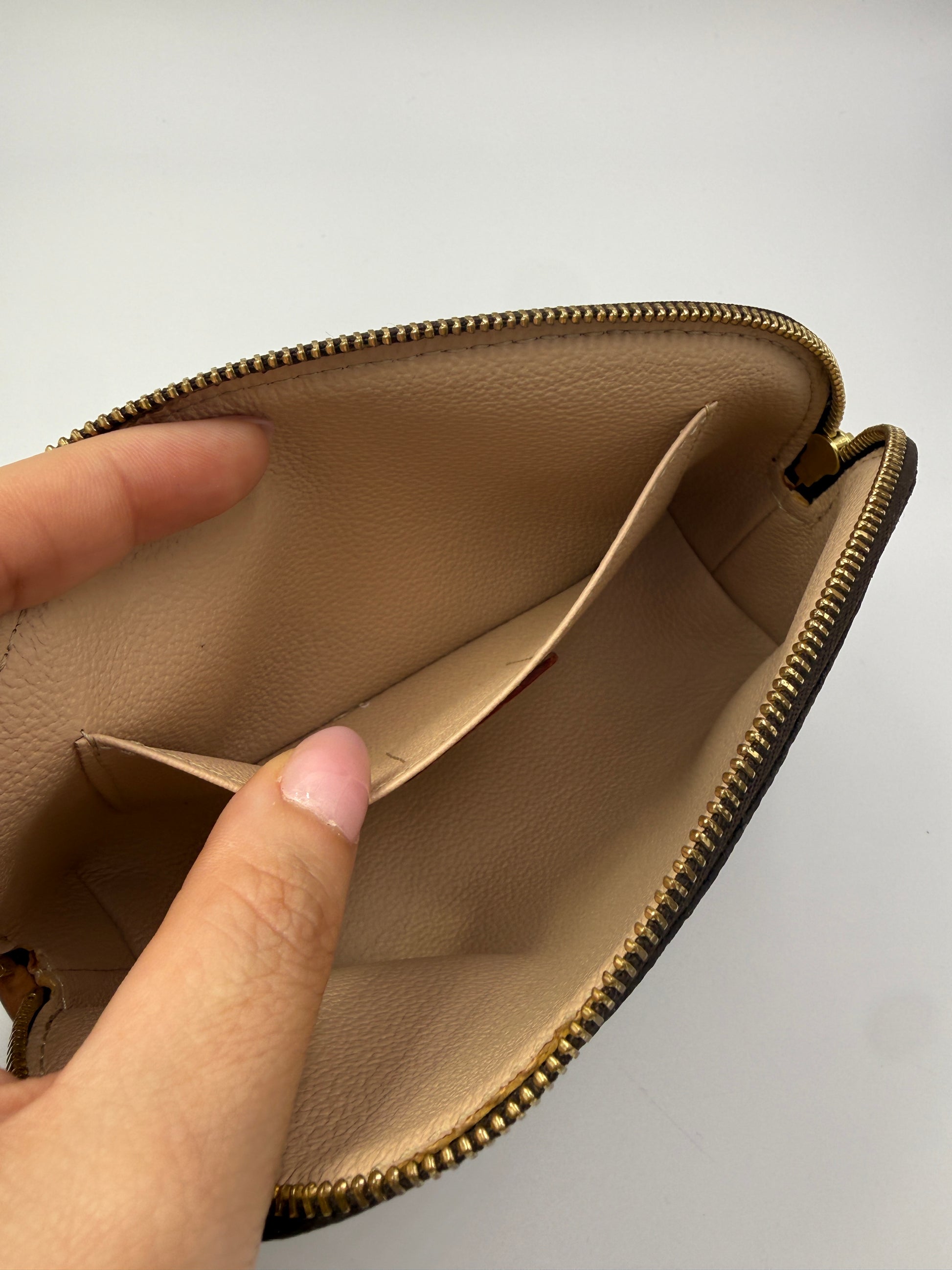 The beige leather interior is clean and smooth, featuring an interior slip pocket for added organization. The gold-tone zipper glides easily and retains a bright shine with only minimal surface wear consistent with gentle use. This size is extremely functional and fits comfortably inside most Louis Vuitton handbags.
