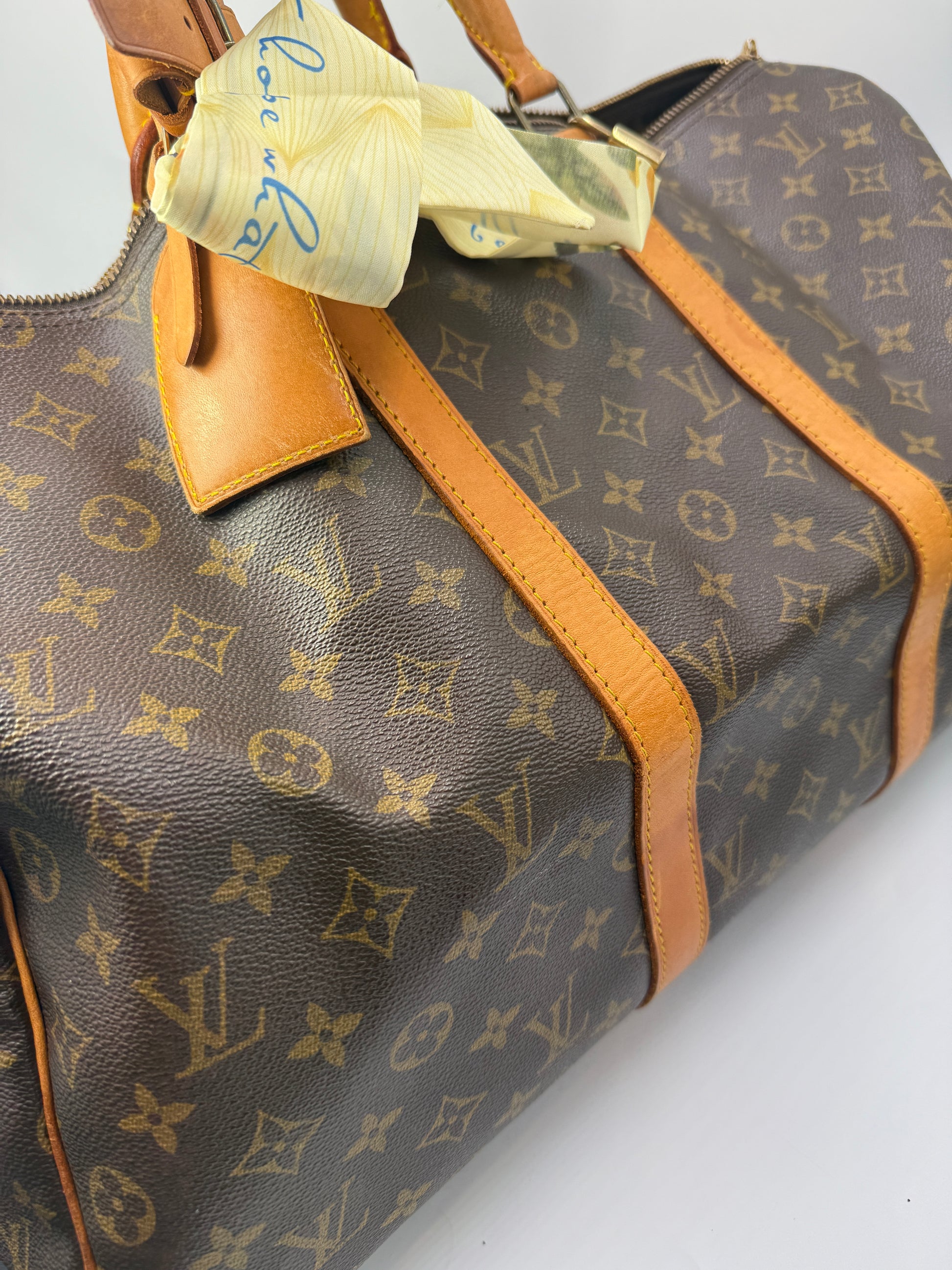 Dual gold-tone zippers glide smoothly and remain in excellent working condition, providing secure access to the spacious main compartment. This Keepall also includes its original lock, luggage tag, and poignet, making it a more complete and desirable set for collectors and frequent travelers alike. The vachetta leather maintains a healthy structure with visible but expected wear consistent with its age, adding character without compromising durability.