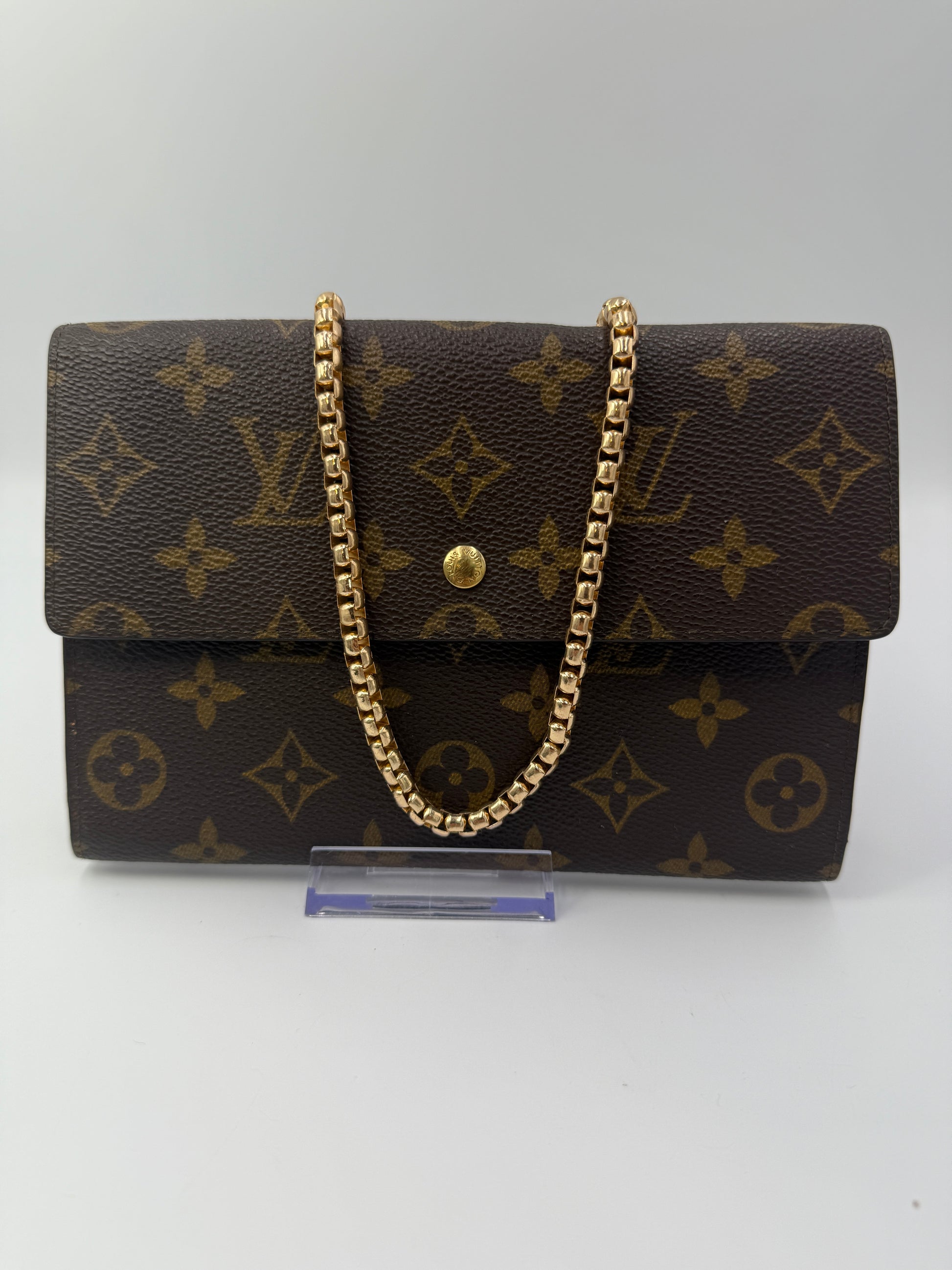 What sets this piece apart? It comes with an unbranded chain and insert, allowing you to transform it into a stylish crossbody bag for hands-free convenience. Whether used as a sleek travel companion or a unique mini crossbody, this vintage Louis Vuitton wallet is a statement of timeless luxury. Don’t miss the chance to own a piece of fashion history!