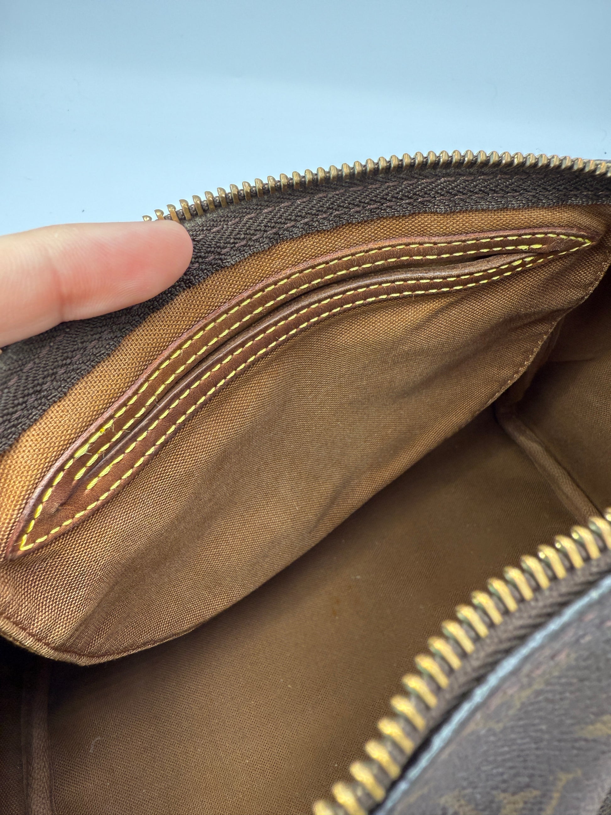 The vachetta leather trim and handles are in good condition, showing natural darkening and patina—a beautiful sign of authentic use and character. The zipper works smoothly, securing your belongings inside the spacious interior, perfect for your daily essentials. Best of all, no odors—just the timeless sophistication of a well-cared-for classic.
