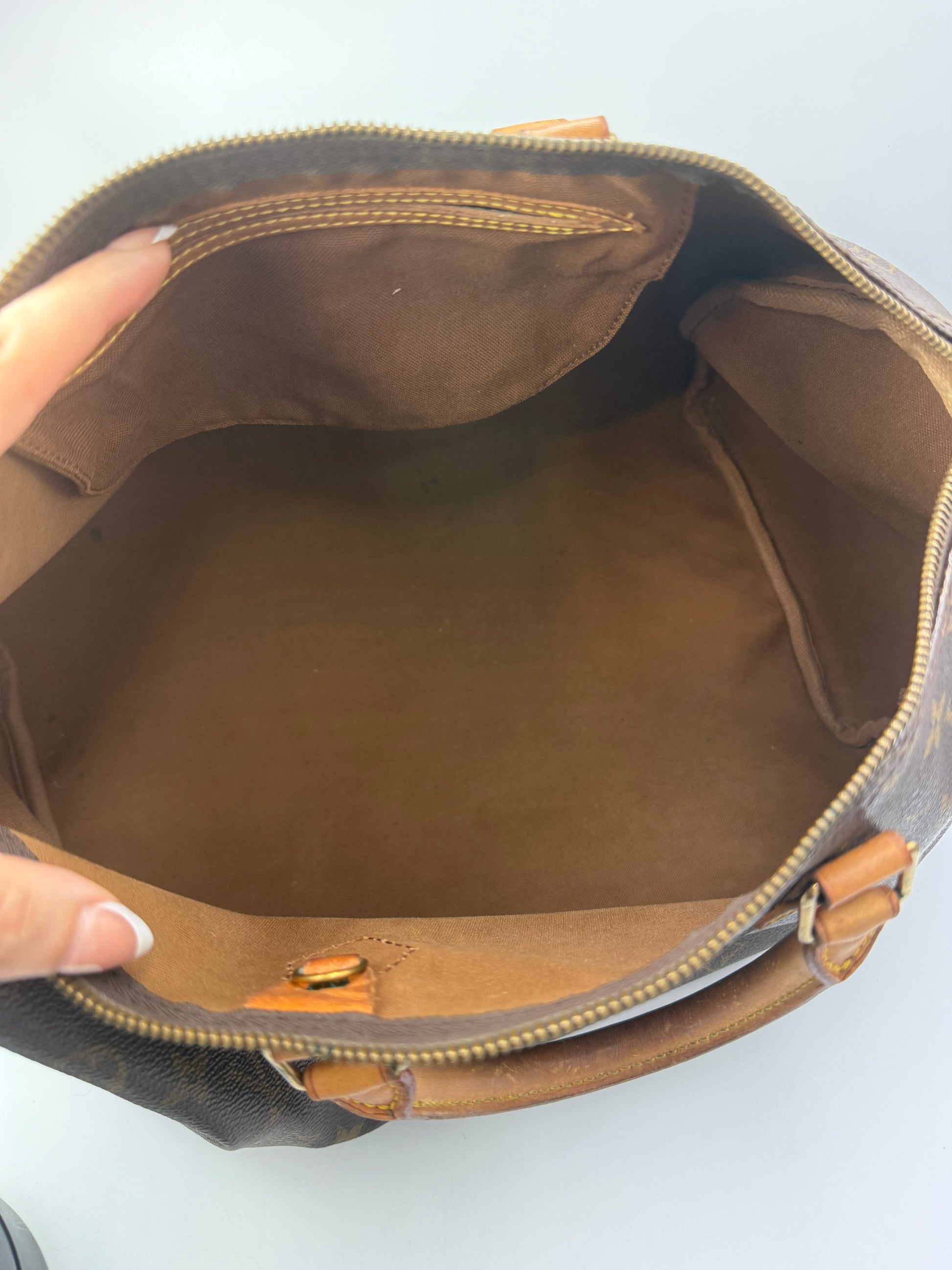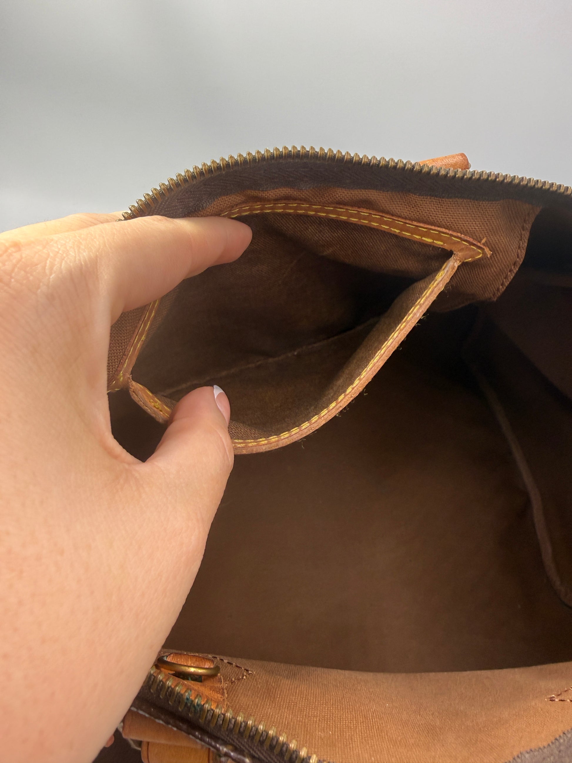 The monogram coated canvas exterior remains vibrant and timeless, while the clean canvas interior features a floating slip pocket for added organization. The gold tone hardware retains its shine, and the zipper glides smoothly. This is a true vintage staple that blends elegance with everyday functionality.