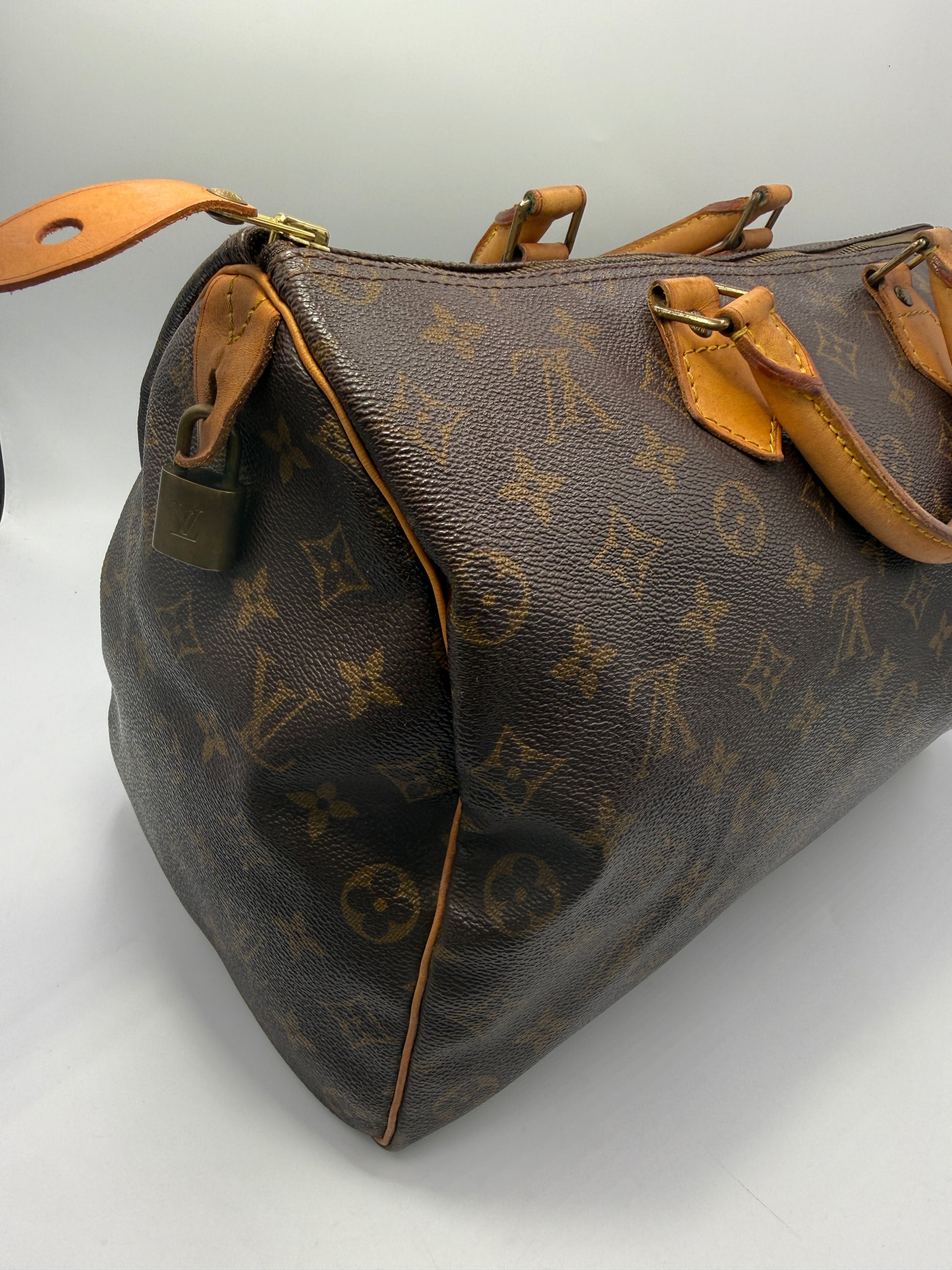 This is a beautiful pre-owned Louis Vuitton Monogram Coated Canvas Speedy 35, measuring approximately 13.8” L x 7.1” W x 9.1” H. Manufactured in 1994, this classic piece showcases vachetta leather accents in a rich, even honey patina. The handles show only minor signs of dryness, maintaining their strength and structure. The leather zipper pull tab is fully intact, and the bag comes with the original Louis Vuitton lock #323 (no key).