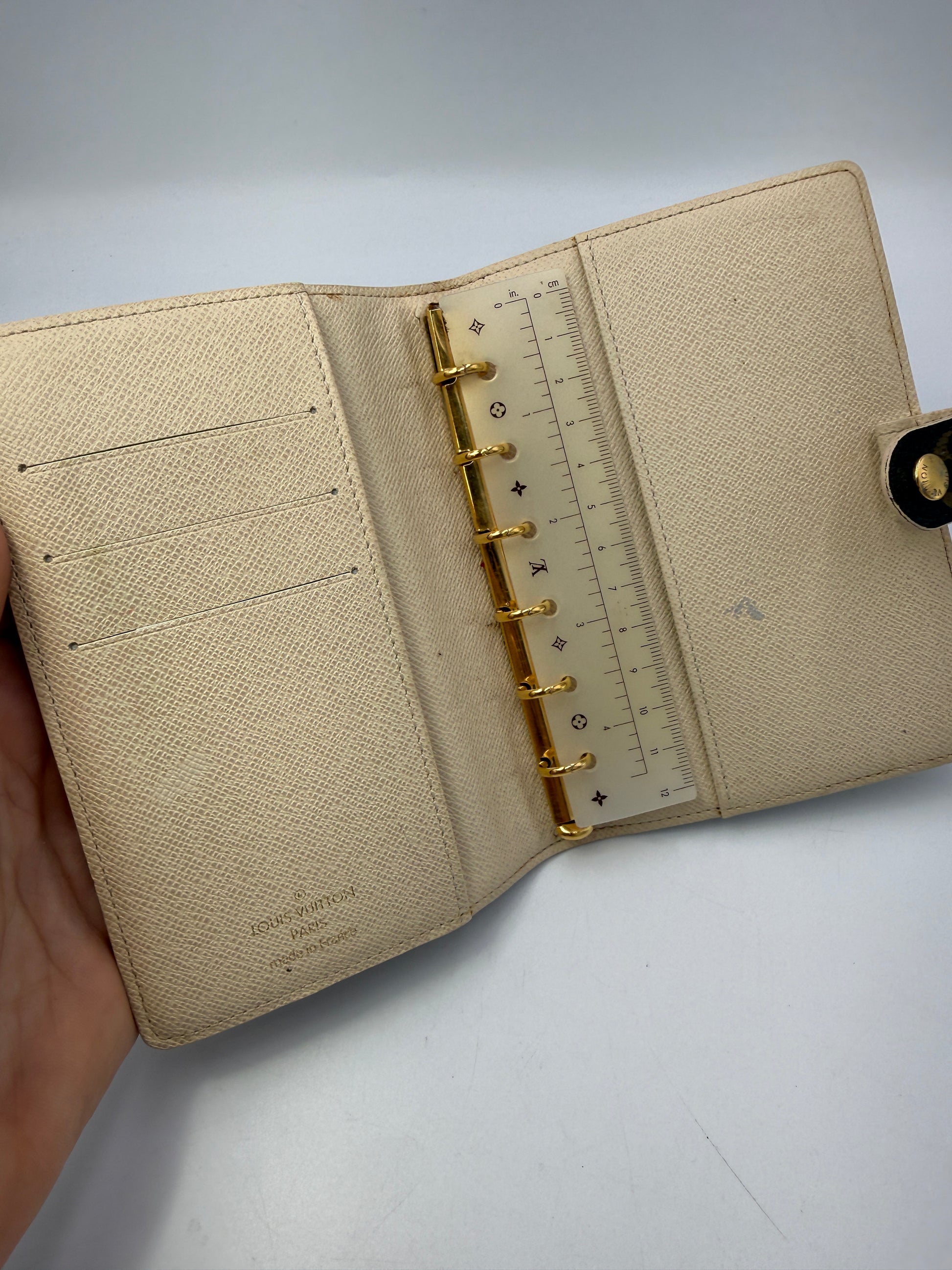 This Louis Vuitton Monogram Coated Canvas Trunk Agenda PM is a rare and highly collectible piece, crafted with the iconic monogram coated canvas exterior and a limited edition trunk-inspired design. The cream-colored leather interior is beautifully contrasted, offering both elegance and practicality with multiple card slots and compartments large enough to hold passports or travel essentials. A 6-ring binder system makes it functional as both an agenda and organizer.
