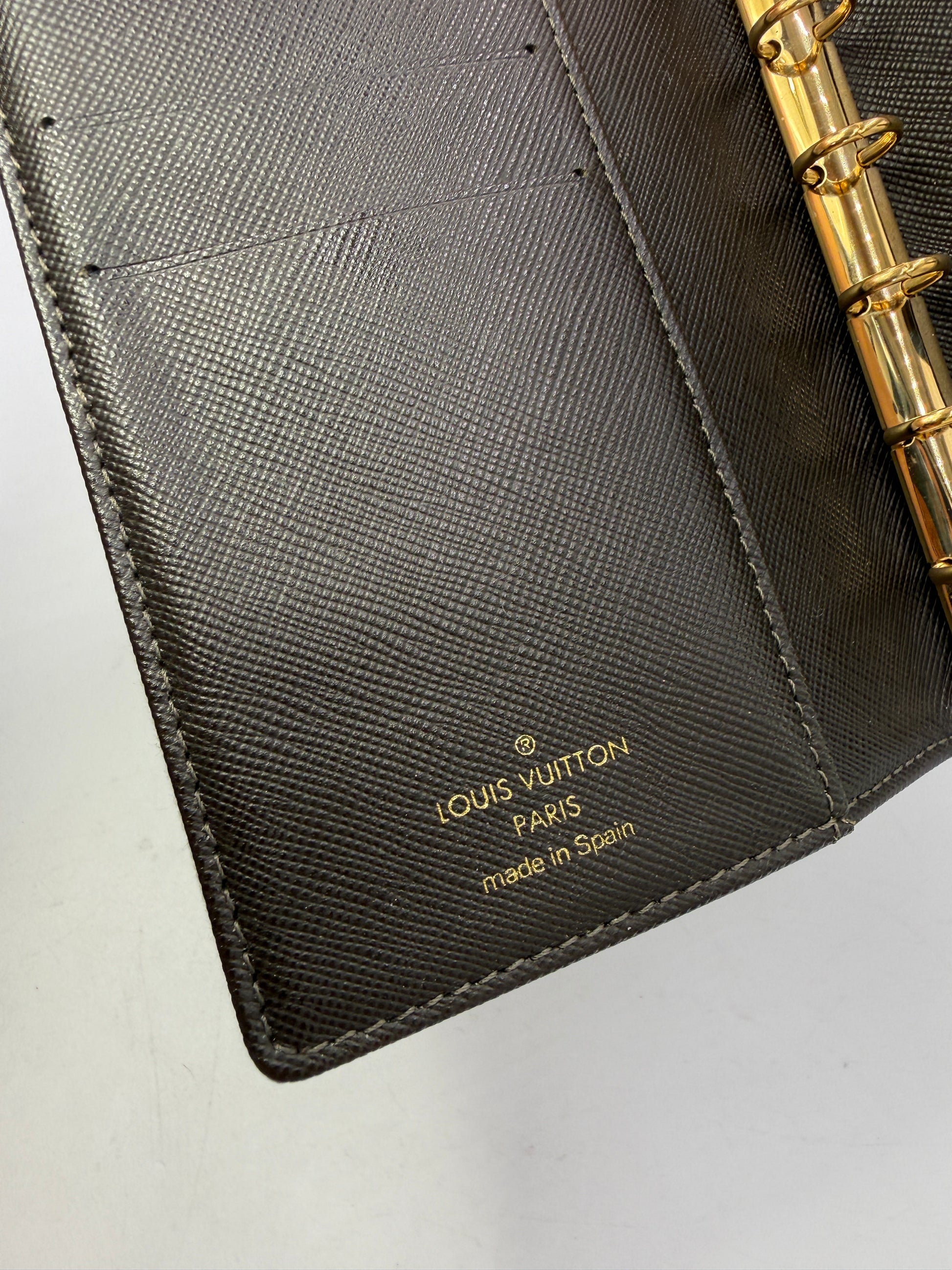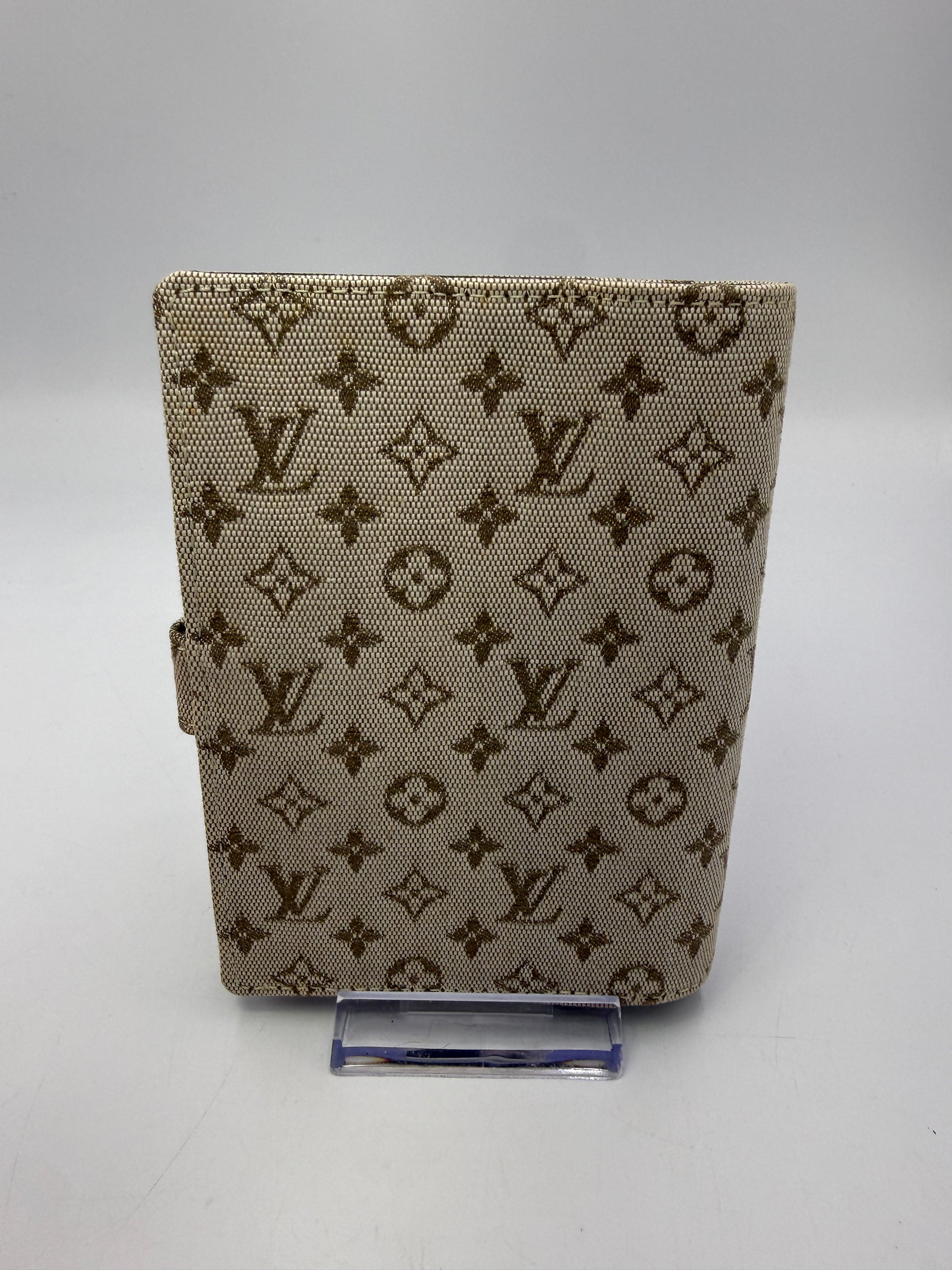 Louis Vuitton Monogram Mini Lin Tan Grey Agenda PM, crafted in 2003, featuring elegant gold tone hardware in full working condition. The exterior showcases the refined Mini Lin design in excellent vintage condition, with fabric and pattern remaining crisp and intact. The interior is lined in black grosgrain leather, with a single minor glue stain in one corner—barely noticeable and not affecting functionality.