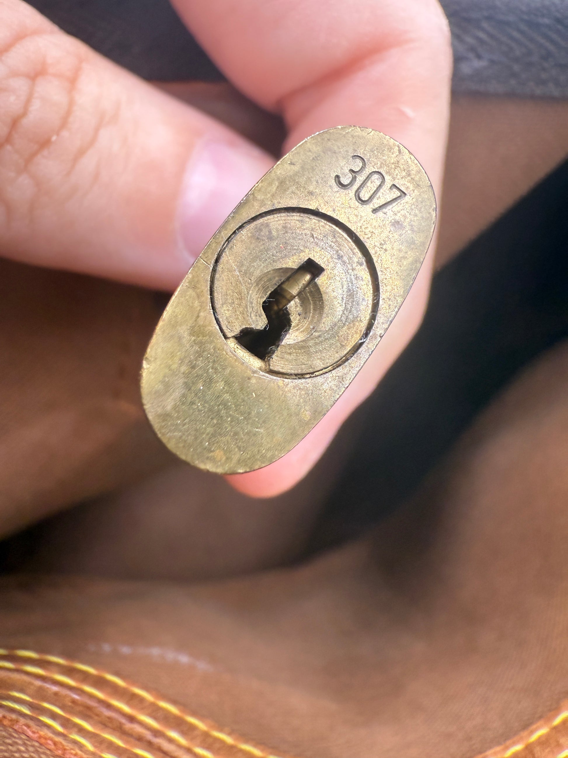 The exterior coated canvas is in excellent condition with no cracks, while the vachetta leather has developed a rich, warm patina—a beautiful sign of its vintage charm. There are no cracks on the leather, and the hardware, including the included lock (#307), is in smooth working condition (note: no key included).