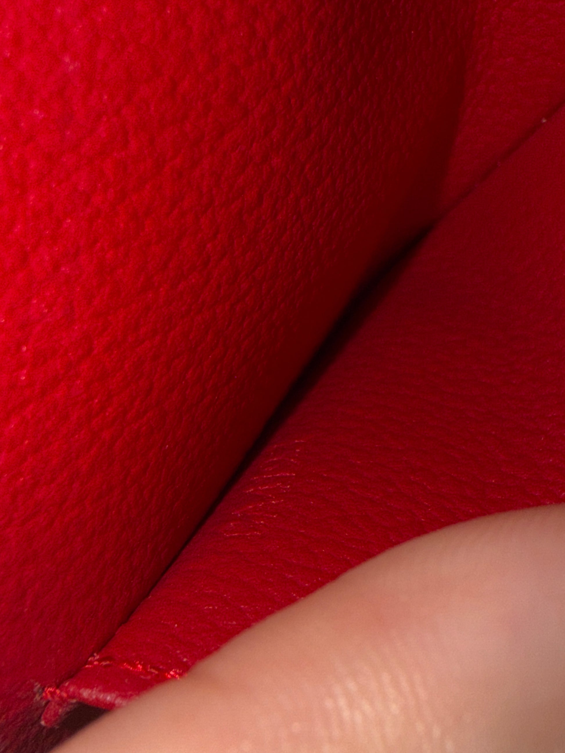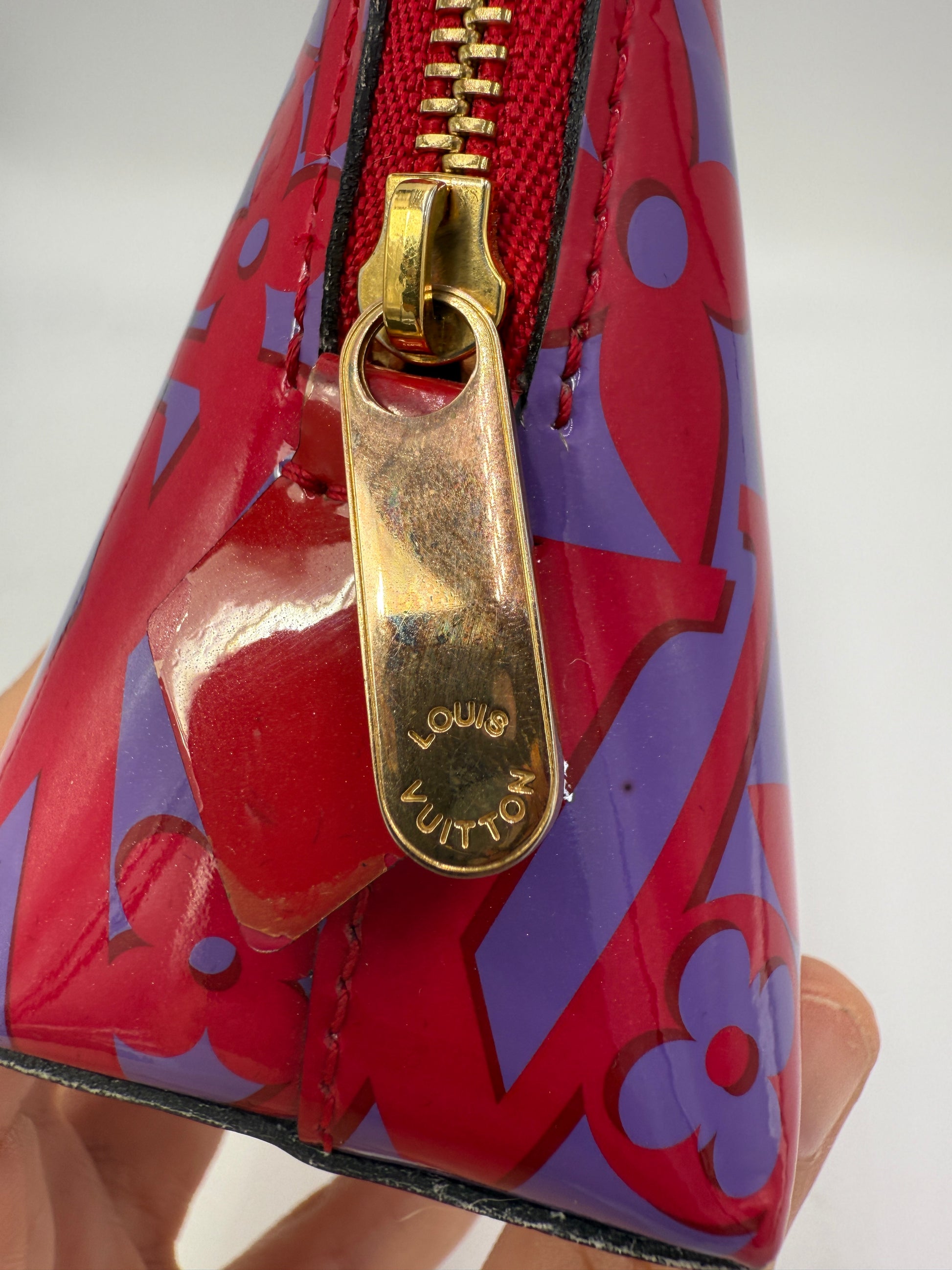 Inside, you’ll find a raspberry leather lining that is smooth and clean, with no peeling, rubbing, or stickiness—a rarity for vernis pieces of this age. The pouch includes one interior slip pocket, ideal for organizing small essentials. The gold tone hardware is in excellent working condition with no silvering or tarnishing. There are no odors present, and the overall structure remains beautifully intact.