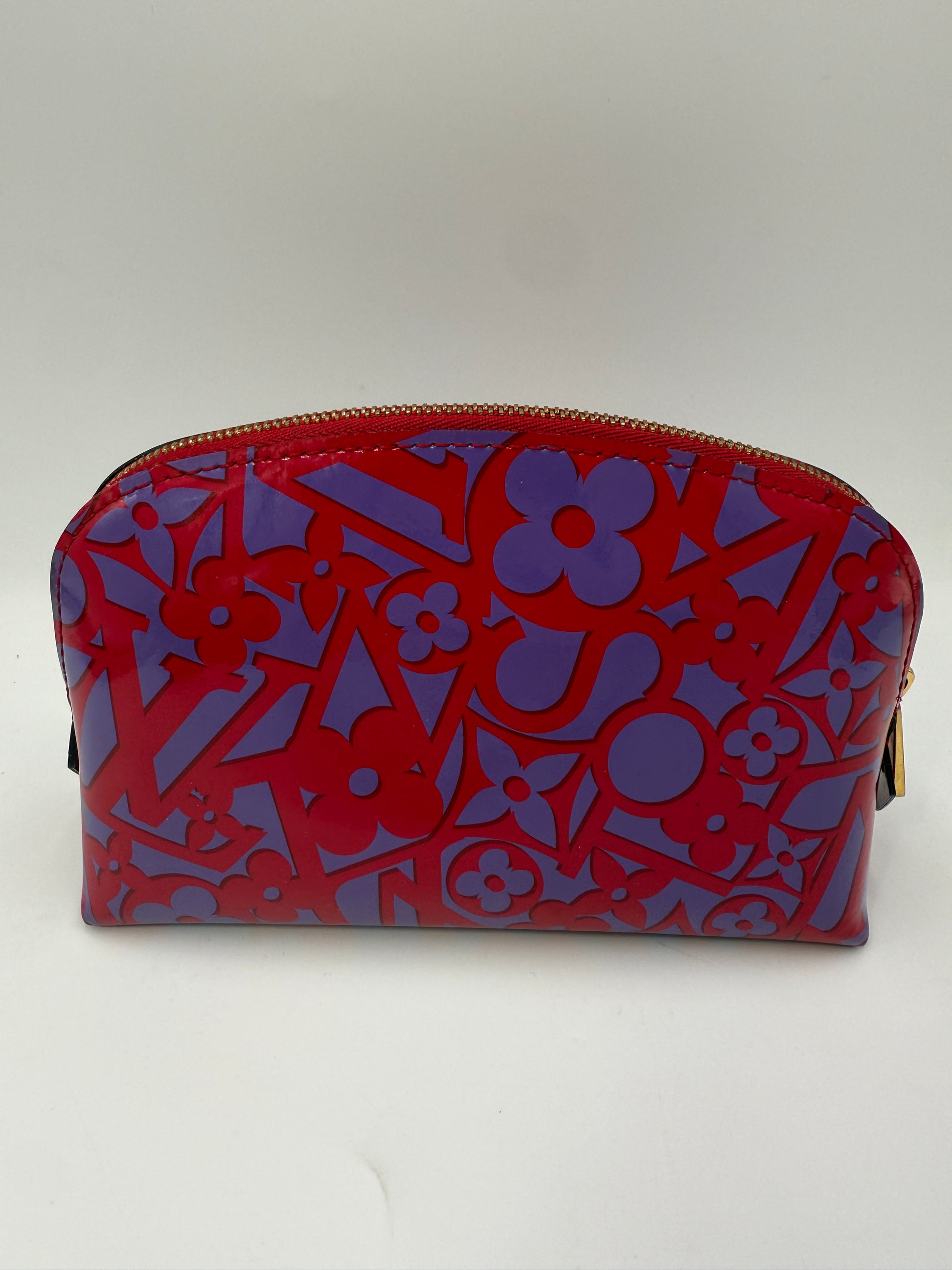 Louis Vuitton Vernis Sweet Monogram Cosmetic Pouch in a vibrant purple and hot pink vernis finish is a rare and eye-catching collector’s piece, originally released in 2013. The glossy monogram-embossed exterior features a striking combination of color and shine that effortlessly adds a touch of luxury to any vanity or handbag.