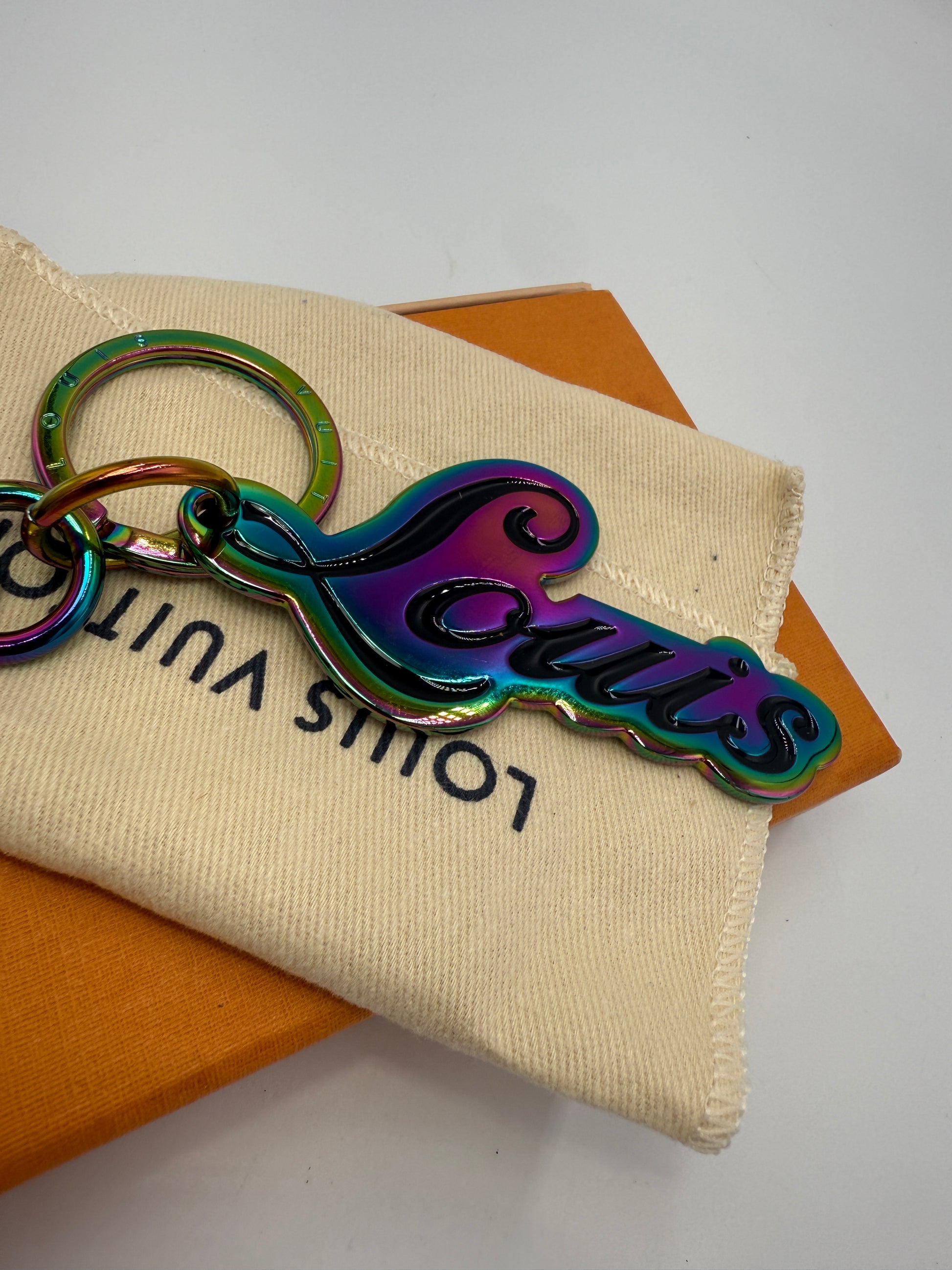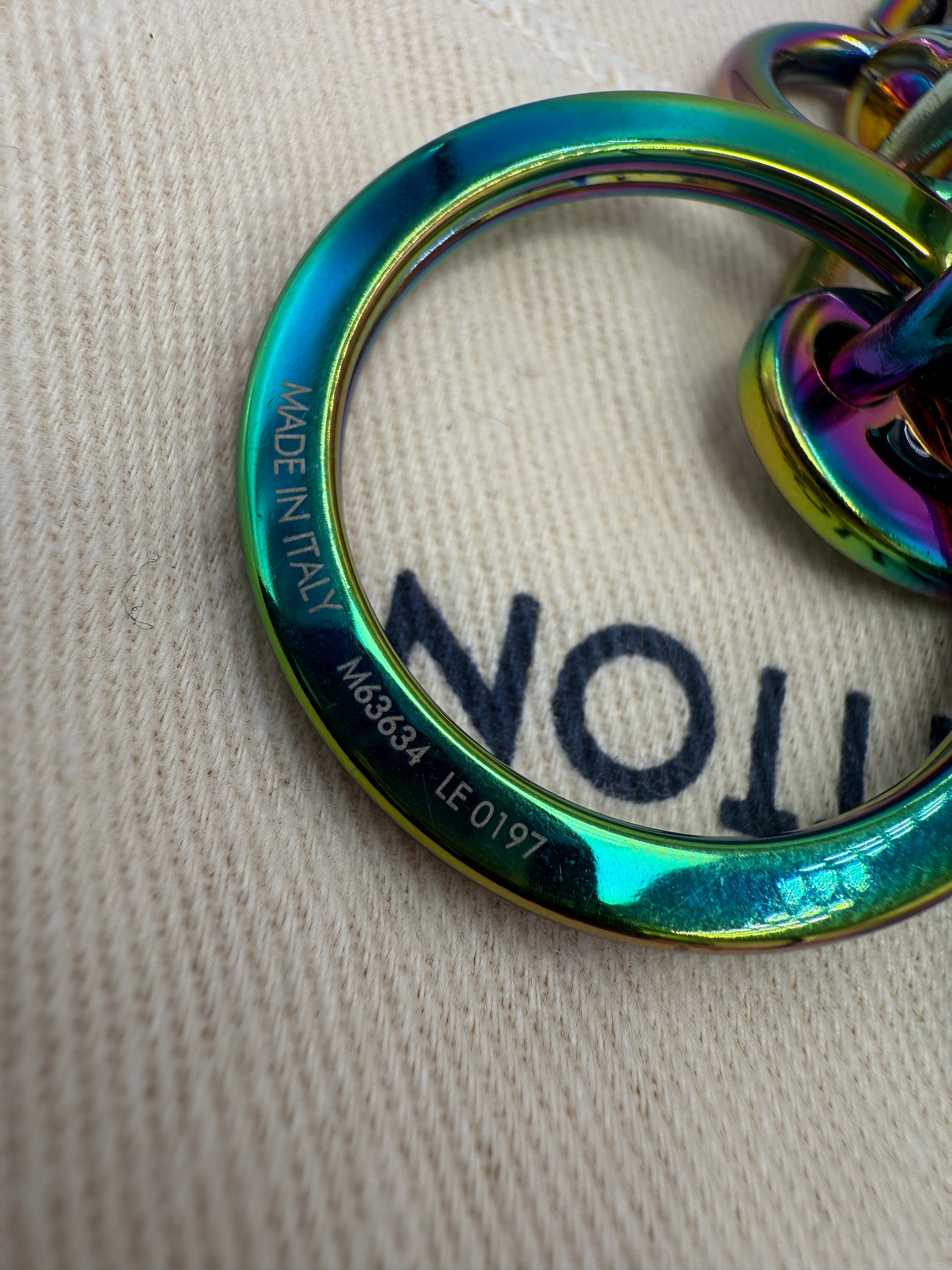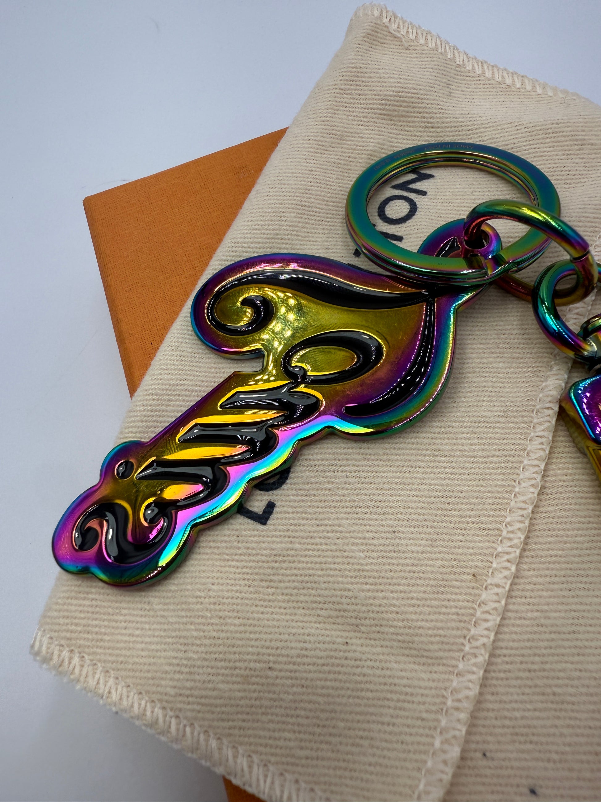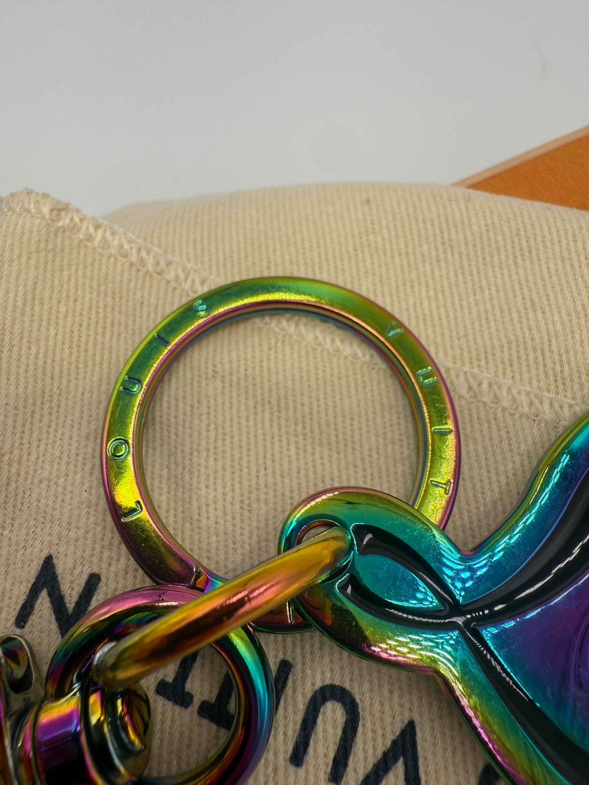 Crafted in sleek metal with an iridescent finish, this piece shimmers in a mesmerizing spectrum of colors—subtle yet striking. The LV x Fragment signature engraving adds a bold, edgy touch, while its durable construction makes it perfect as either a statement bag charm or a stylish key holder.