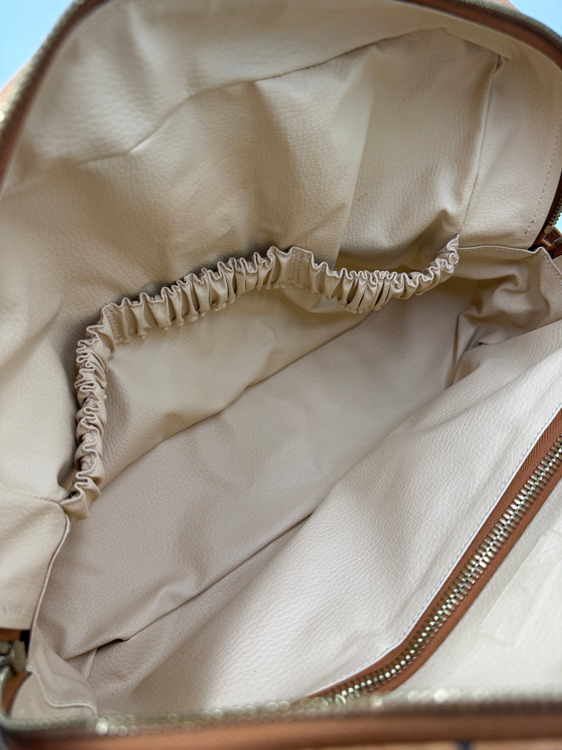 The interior is exceptionally clean and offers generous space, including a long zippered compartment and multiple pockets perfectly designed for toiletries, bottles, and cosmetics—making it a true travel essential. The exterior handle adds convenience and style, ideal for grab-and-go moments.