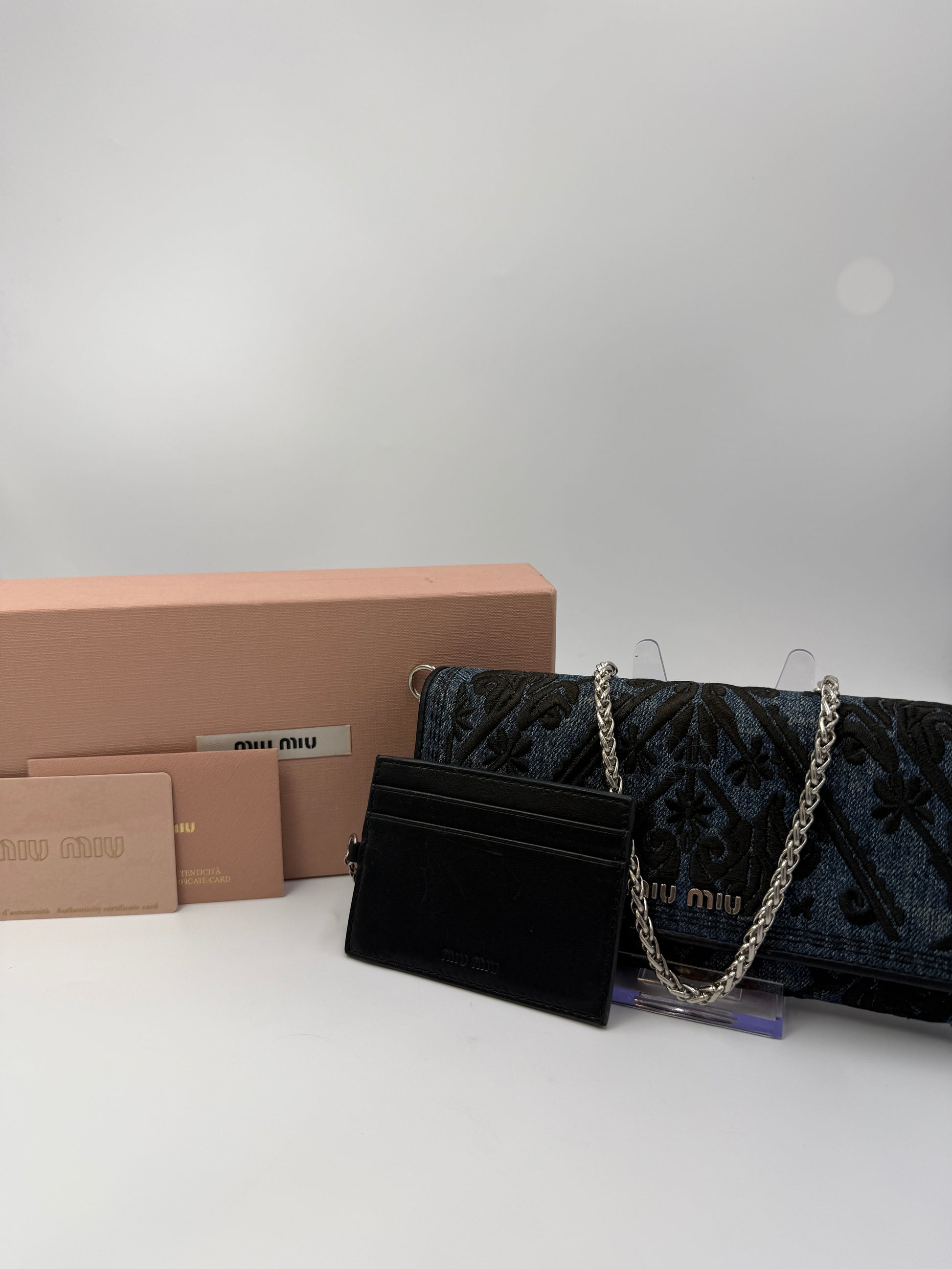 This Miu Miu Blue Denim Embroidered Long Wallet with Detachable Card Holder is a rare and striking statement piece that captures Miu Miu’s signature blend of youthful edge and refined Italian craftsmanship. The exterior is beautifully rendered in blue denim with intricate black embroidery, creating a textural contrast that feels both modern and playful. Subtle fading throughout the denim adds unique character, giving this piece a touch of vintage charm without compromising its structural integrity.