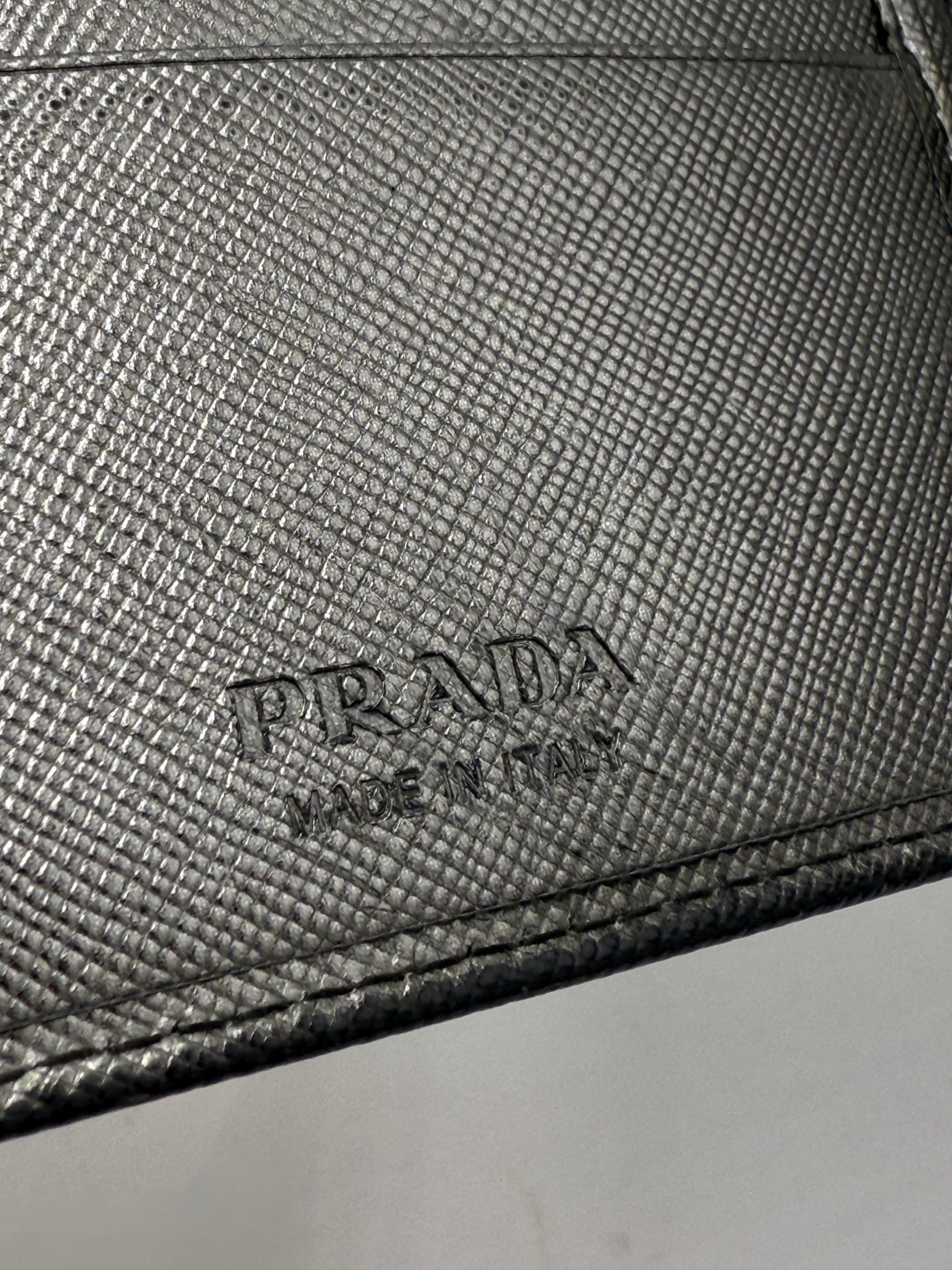 Elevate your everyday essentials with this sleek and sophisticated Prada bifold wallet, crafted in dark slate Saffiano leather—a hallmark of the brand’s iconic, scratch-resistant finish. The silver metallic Saffiano leather interior adds a bold, luxurious contrast, paired perfectly with silver-tone hardware for a modern, refined touch.