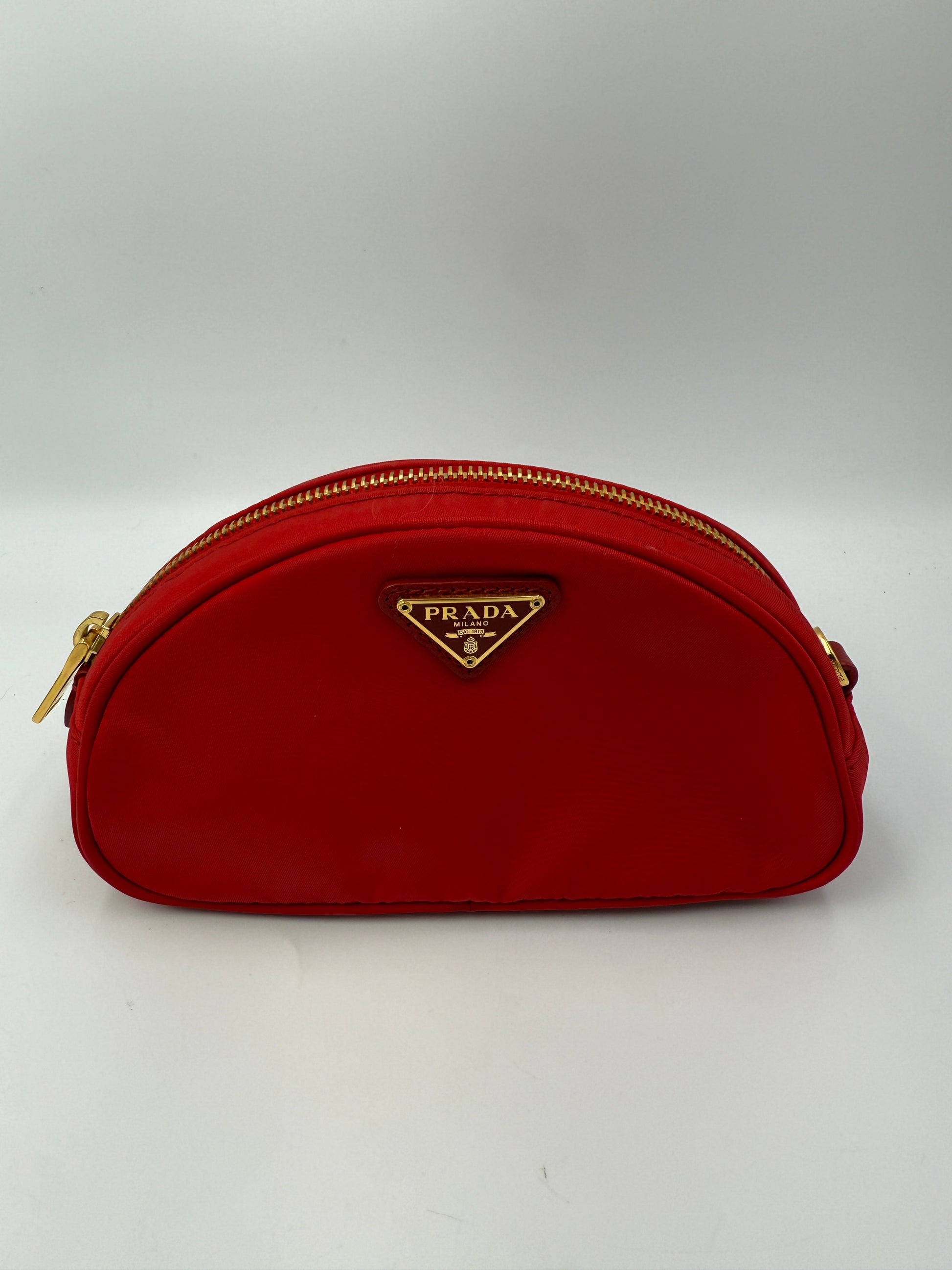 The exterior features the iconic Prada enamel triangle logo in matching red at the center front—an unmistakable hallmark of the brand. Complemented by gold-tone hardware, the zipper glides smoothly and securely closes the pouch. All hardware is in excellent working condition with no silvering or tarnish.