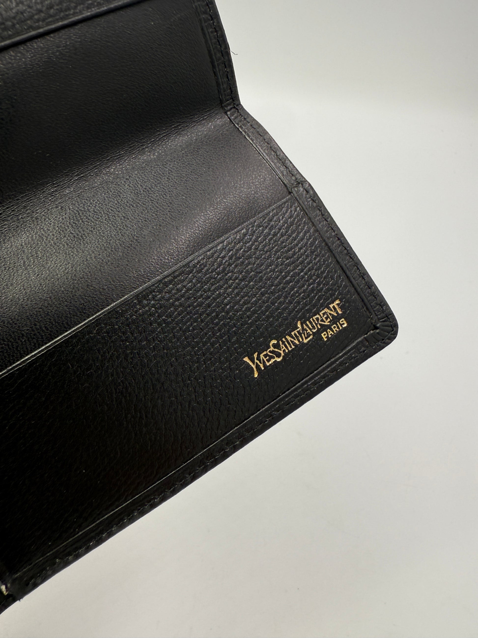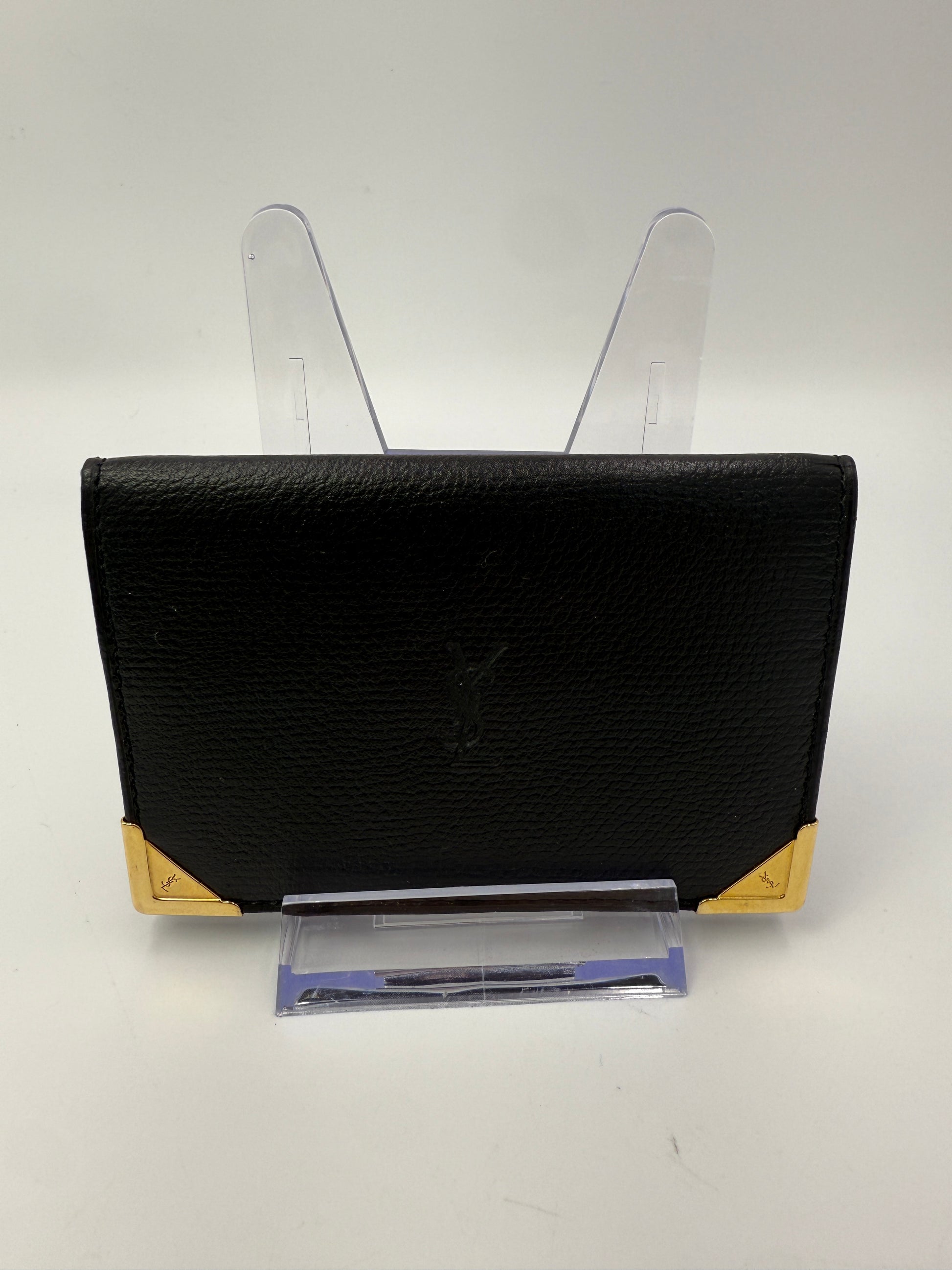 Add a refined edge to your collection with this Vintage Yves Saint Laurent Black Leather Compact Bifold Card Holder — a timeless essential crafted with iconic YSL sophistication. Made of supple black leather, this sleek piece is accented with gold-tone metal corner tips on the exterior front, offering a subtle yet luxurious statement.